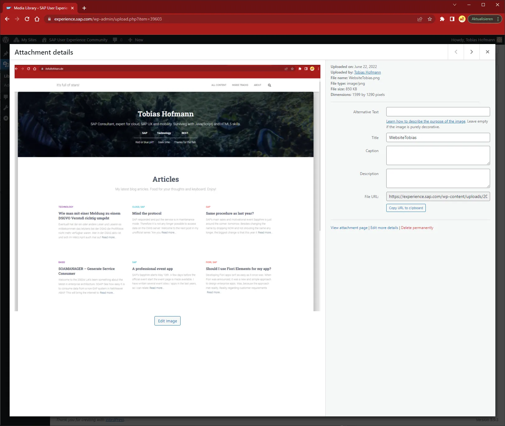 For the media library, no approval workflow was needed. Once uploaded, the file is accessible on the internet. Files stored in the WP library have public accessible link and it is not necessary to embed them in a post first. Therefore, a picture of my website was now accessible through a website run by SAP, under the SAP domain. To evaluate if this is bad or good, let me provide some possible use cases: