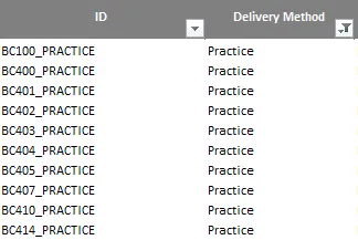 But how to find the technical exercise name? First, find courses that come with exercises. Filter for delivery method practice in the Excel file.