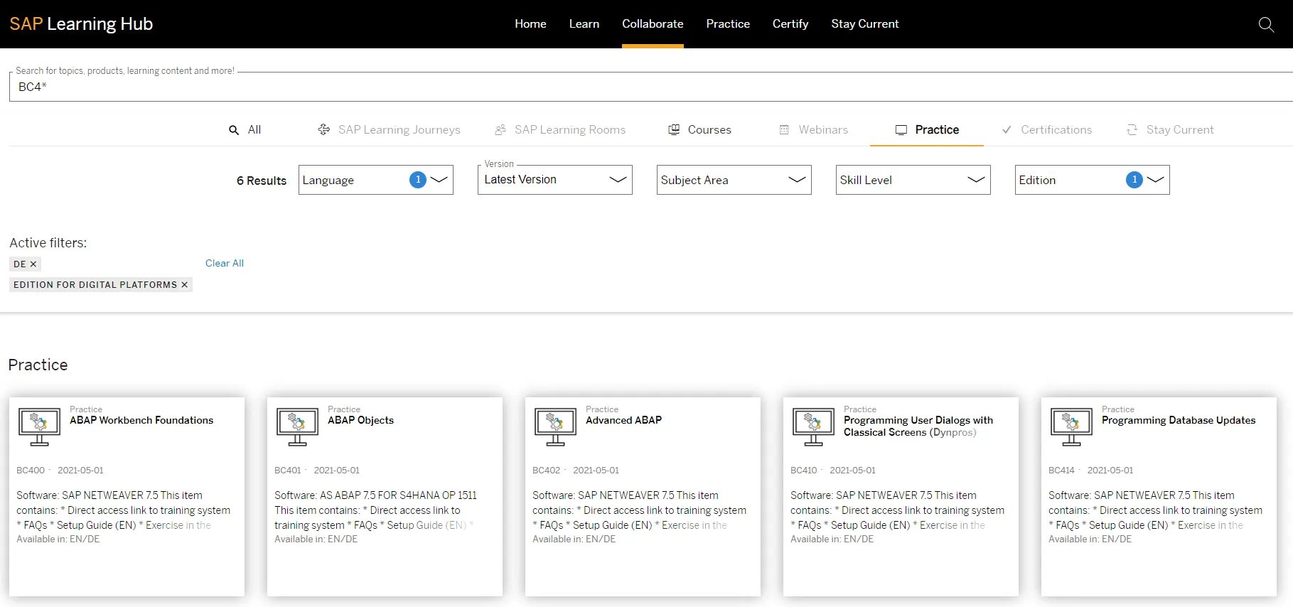 Selecting a practice shows that a practice consists of several documents, most important the ones for the actual exercises. For BC401 the exercise document is available in English and German (EN and DE).