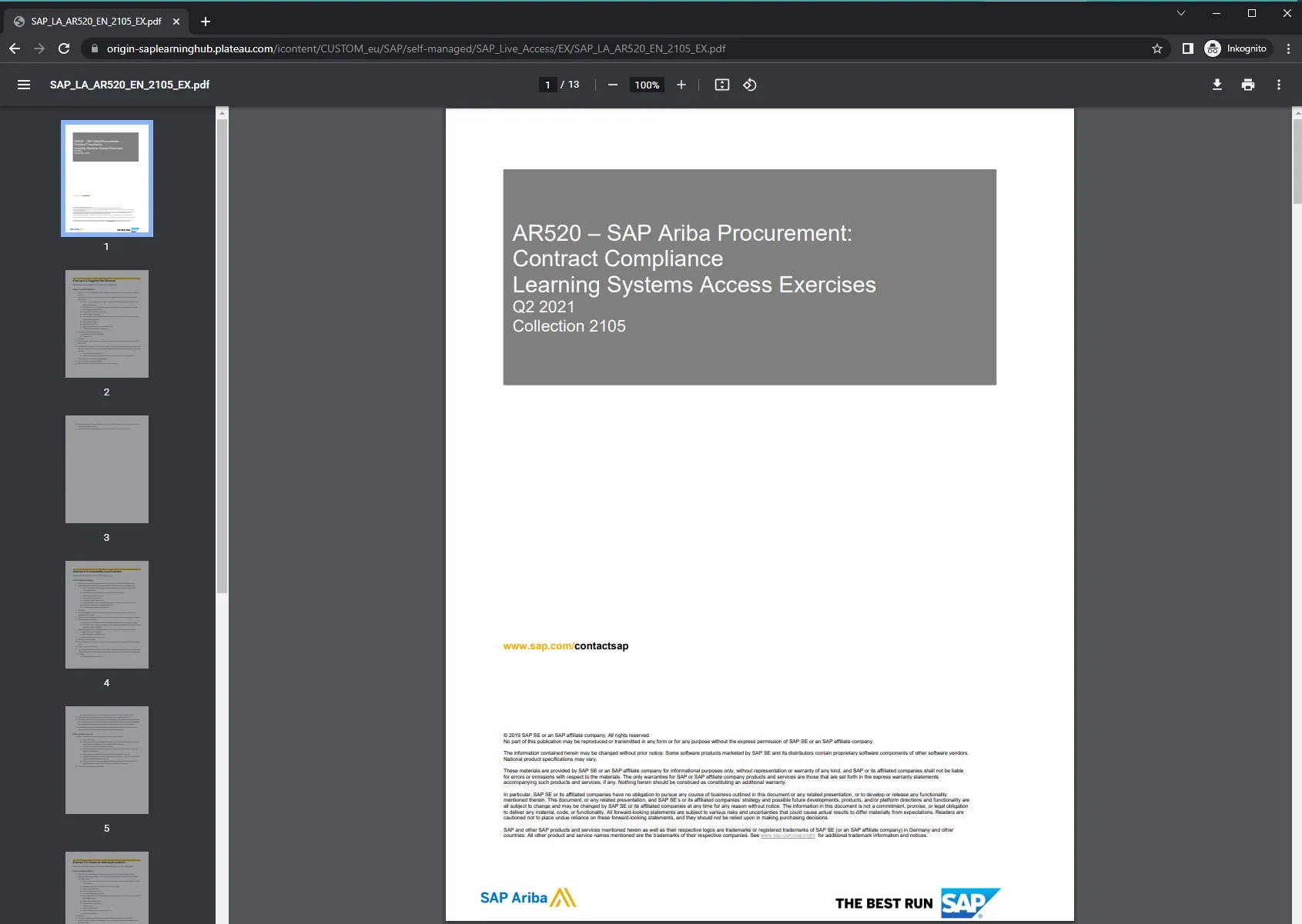 In my last post about SAP Learning Hub 🔗 I showed that it is possible to access learning material PDFs that are not part of your active subscription. All you need to know is the URL to a PDF to access it, independent if the course is part of your subscription or not. The information needed to construct such a URL is available to every SAP Learning Hub (LH) subscriber. Seems that some access checks are not working correctly at the file server that hosts the PDF files. At least you need to have a valid subscription. That is: you must be logged on to LH to be able to access the files. While the role-based access protection is not working, a valid session the plateau service is needed. Ignoring the basics of security and not validate if at least the user is logged would not happen. Anonymous access won’t happen to a cloud company.