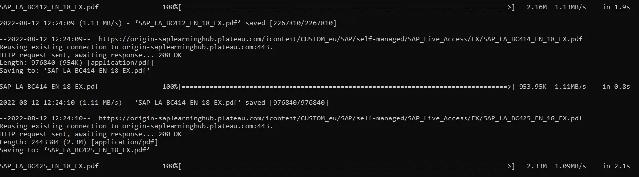 You might think: nice but doing this for every exercise document in the Excel is too much manual work. Well, as with the course PDFs, the firewall configuration SAP uses is deeply relaxed. I put all the possible links in a text file and then started to download them. One by one, in one single download run.