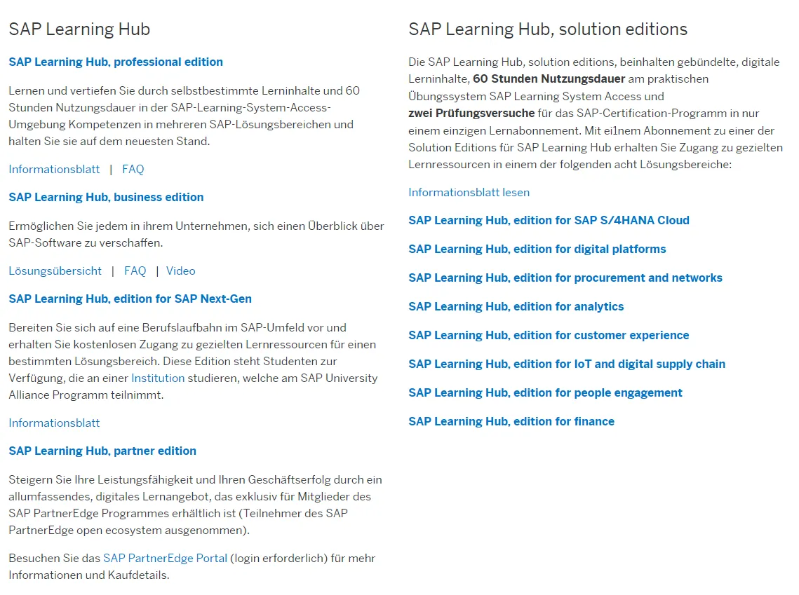 The content of each (solution) edition varies, giving you access to different trainings and material. If you are not interested in content for developers and not in FI content, you can save real money. Don’t buy the professional edition, go for the solution edition and save 1.2760 €. But, if you need access to several training contents that are not part of the same solution edition, you’ll have to go for the professional edition. To get a good overview of what is included in each edition, SAP provides an Excel file 🔗 (yes, Excel 🔗 and yes, activate macros).