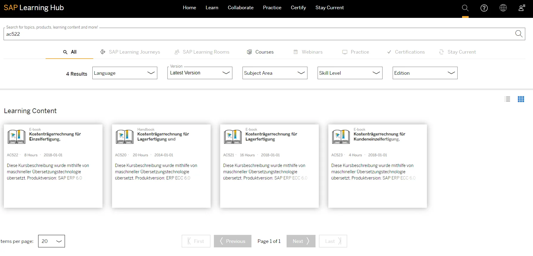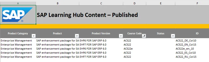 The Excel file helps you to find a training, identify the delivery type (e-learning, e-book, etc.) and the technical course name. Let’s take for instance a course that is part of the professional edition, but not of the solution edition digital platform: AC522: Cost Object Controlling for Make-to-Order, Production Industries.