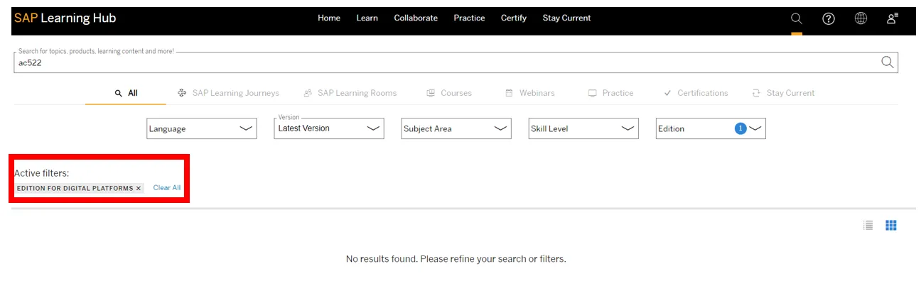 Clearing the LH subscription filter, thereby enabling the search for all available courses in LH, the search results for the course AC522 will be displayed.