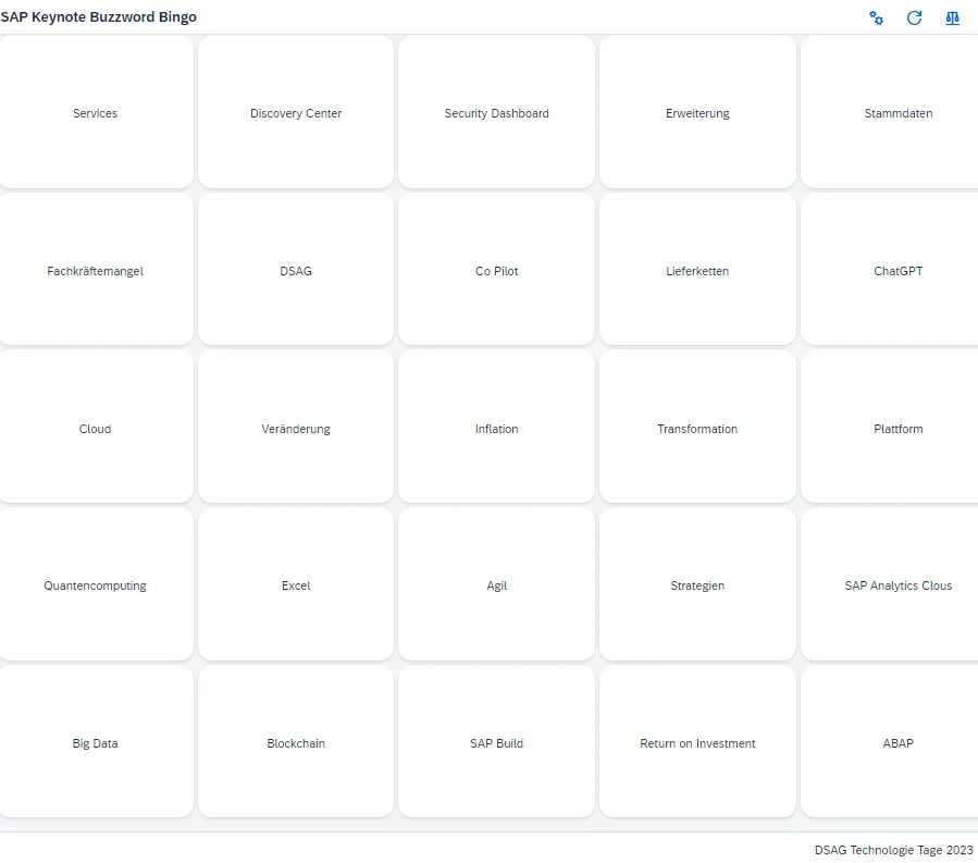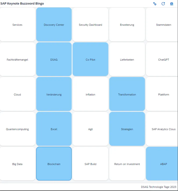 Um auch bei Keynotes, die nicht in die Geschichte eingehen werden, einzuschalten und wach zu bleiben, bietet es sich an ein Spiel zu spielen. Ein Spiel, das dazu animiert fokussiert der Keynote zuzuhören. Aus diesem Grunde wurde vom SAP Stammtisch während der Corona Lockdowns eine Tradition begründet die auch in der neuen Welt fortgelebt wird: SAP Keynote Buzzword Bingo. Vom passiven Zuschauer wird man zum aktiven Spieler. Das Spiel kann hier im Browser (auch mobil) aufgerufen werden. 🔗 Es ist nicht notwendig oder vorgesehen sich die Karte auszudrucken oder gar vor Ort auf den Stühlen zu verteilen. Es wird nur Internetzugang benötigt – was ja wiederum bei so mancher Veranstaltung ein Problem ist. Aber der Wille zählt.