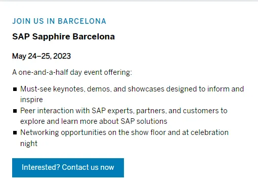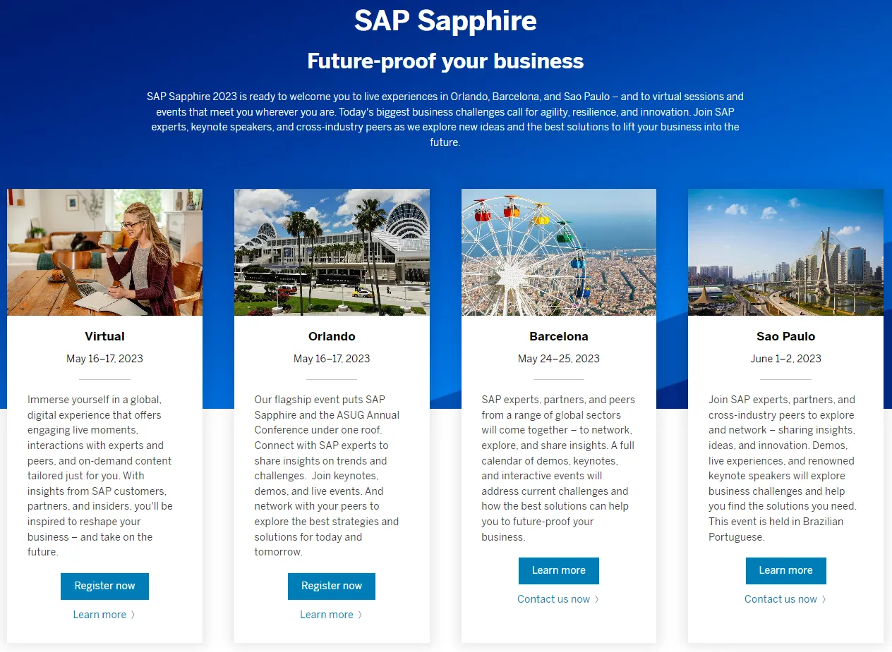 Sapphire 2023 i đź”—s already happening next week, May 16-17. It is again an on-site event at Orlando, but is also offered as a virtual event. Registration for the virtual event is free. SAP is again bringing the on-site event to several locations.
