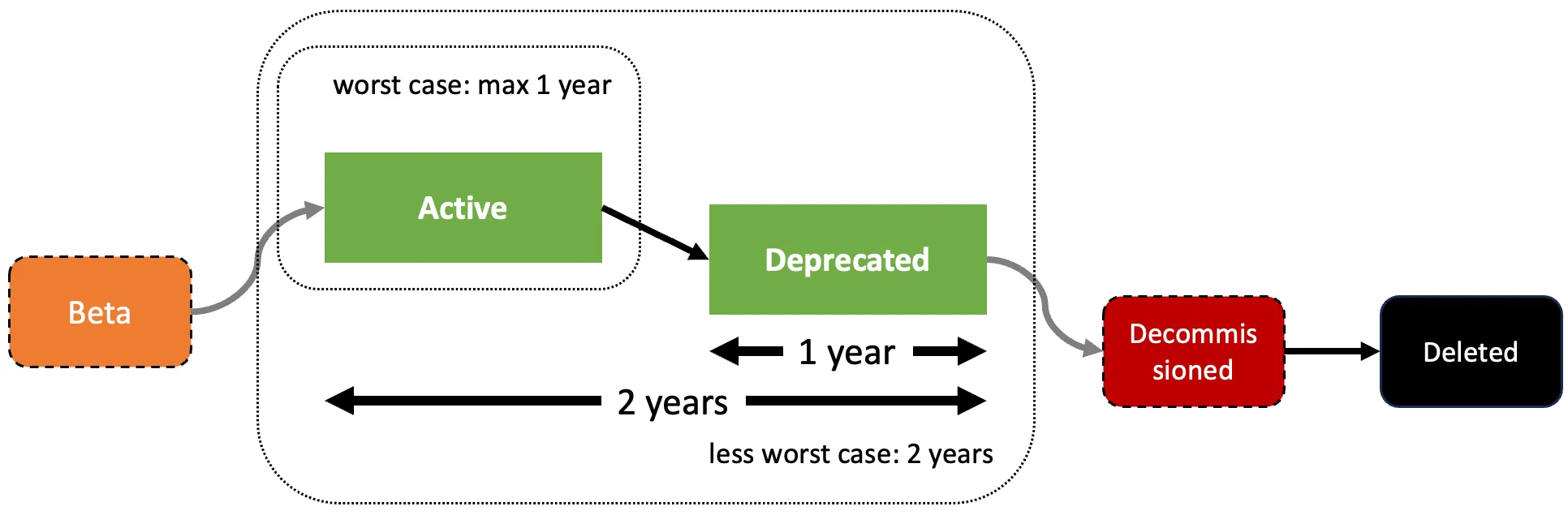 The happy phase - the green boxes - where you can use the API is 1 year, counting from when the API is set to active. Everything on top is bonus. Be fast when it comes to API adoption. If you enter the lifecycle too late, you will have to cope with more problems.