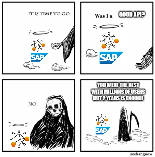 What are the implications? First, SAP does nothing unusual here. Many APIs from other vendors are also deprecated from time to time. Many APIs simply evolve over time (1.0.0 -> 1.5.9 -> 2.6.2). The question is as always: can we apply what works for others to SAP powered business scenarios too? It takes time at customers to adopt to a new solution. The number of customers that will start using in productive usage an active API at day 1 is close to zero. Planning, evaluation, coding, testing, roll-out, all takes time and even when it only takes 3 months, the intended usage time of the solution might be 5+ years. Deprecating (and even deleting) an API is common. Any project should be prepared for this scenario. The question is how much of a PITA the change this triggers will be. Is there a successor in place? Is it API compatible? Are the criteria which lead to a deprecation transparent? Can this be influenced by customers?