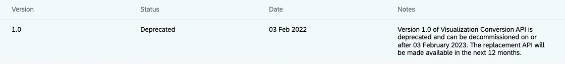 Successor: SAP can deprecate APIs when there is an compatible successor available. If version 1.1.0 is available, 1.0.0 can be deprecated. In case the successor changes the API and the app can break because of this (1.0.0 -> 2.0.0), deprecation should be 2+ years with a total lifetime of at least 4 years. Same 2+ years when no successor is available.