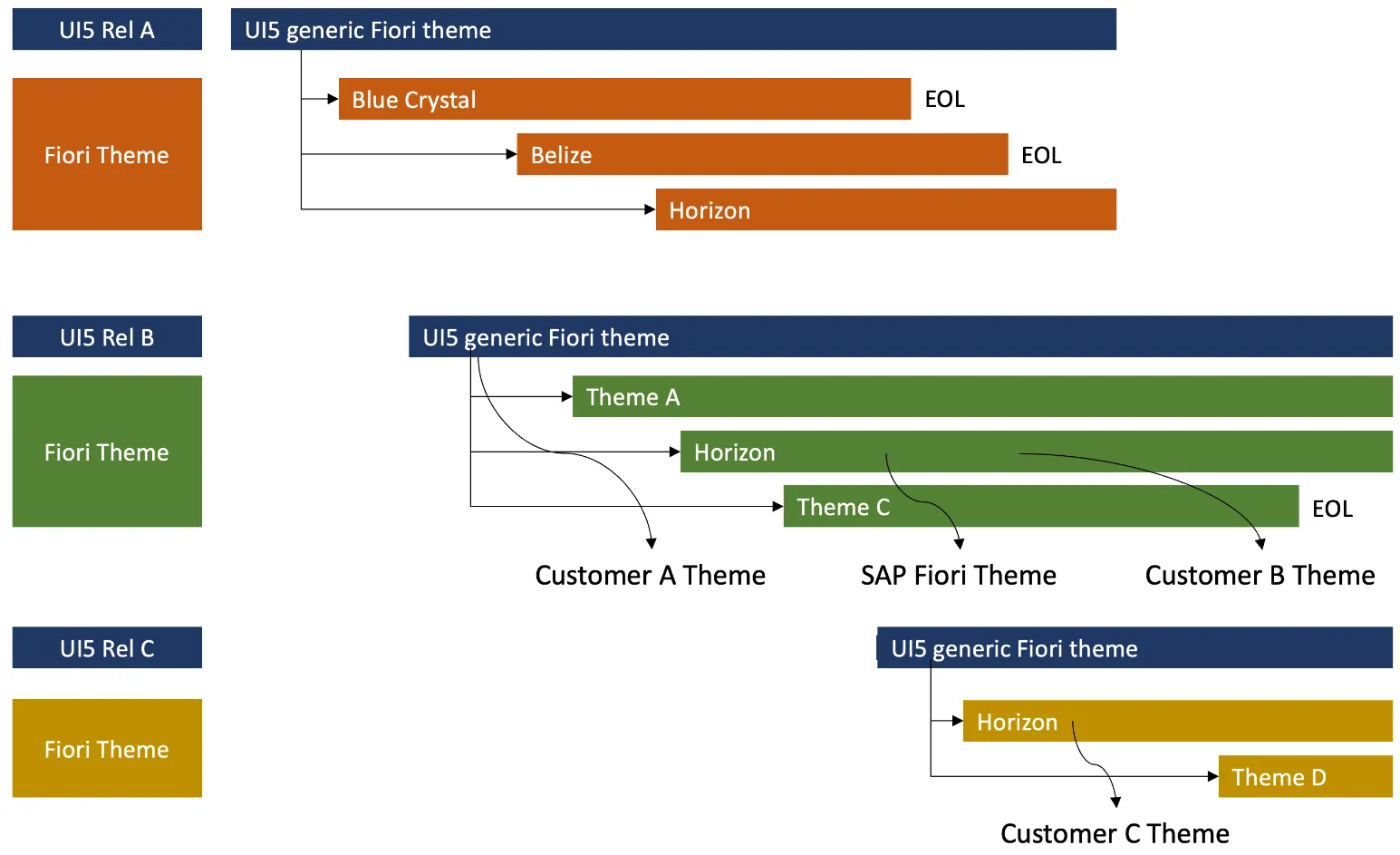 This might seem confusing. I hope the following graphic makes it easier to understand the idea. Take a future UI5 release named B. It is shipped with a base Fiori theme that customer A uses to build its own theme. The base theme is supported for as long as UI5 release B is supported. For new fancy Fiori UX stuff, SAP releases theme A and C. These Fiori themes maybe highlight some super cool AI stuff. Or offer a new level of UI harmonization between the different available UI technologies. There is also the “old” Horizon theme available. As a project, it might have received EOL for the UI5 release A, but not for UI5 releases B and C. Customers can use it to build their custom theme on top of it.