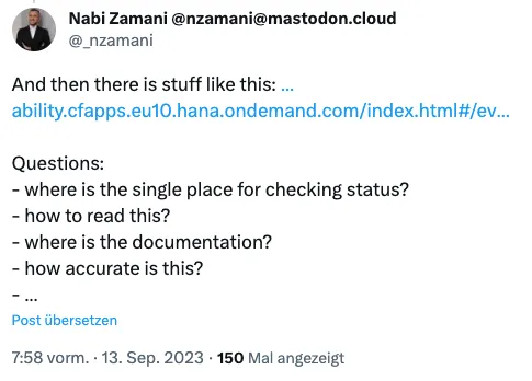 The SAP Cloud did not have the best week recently (11. September 2023). Some services were not available for a few hours. Nothing new, nothing to worry about too much.* Services returned to normal state after a while and in case you were affected, you check the status page 🔗. The page SAP provides is for creating trust – guess why the page is located under trust center. Just that the communicated status was not exactly what you might expect. This started a small discussion on Twitter 🔗. The discussion was joined by Lars, Nabi and Marc sharing their experience and escalated rather quickly when Nabi posted this tweet 🔗: