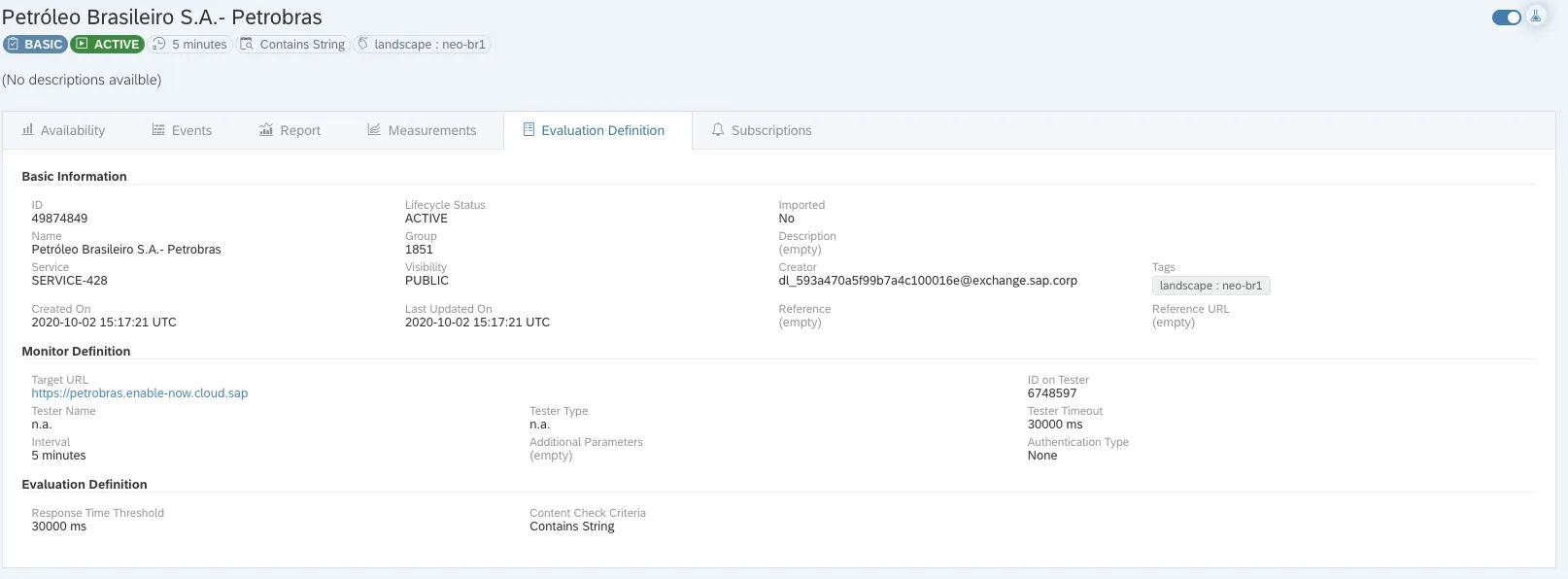 The app allows to access monitoring information. They are called evaluations. These are created for specific BTP services. It gets interesting as these monitoring services contain customer names. Here in the example the configured monitoring with the name Petrobras Brasileiro S.A. While the name could be freely chosen, I know that this is an SAP customer. That I can see this with my S-User from a different company, not related to the other company, is unfortunate. The reason is that the visibility of the evaluation is set to public. And not e.g. to SAP internal. As long as SSO works, and the app accepts my S-User as a valid user, I can log on and see the public visible monitoring data.
