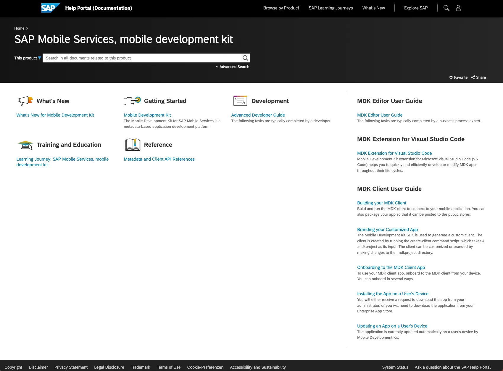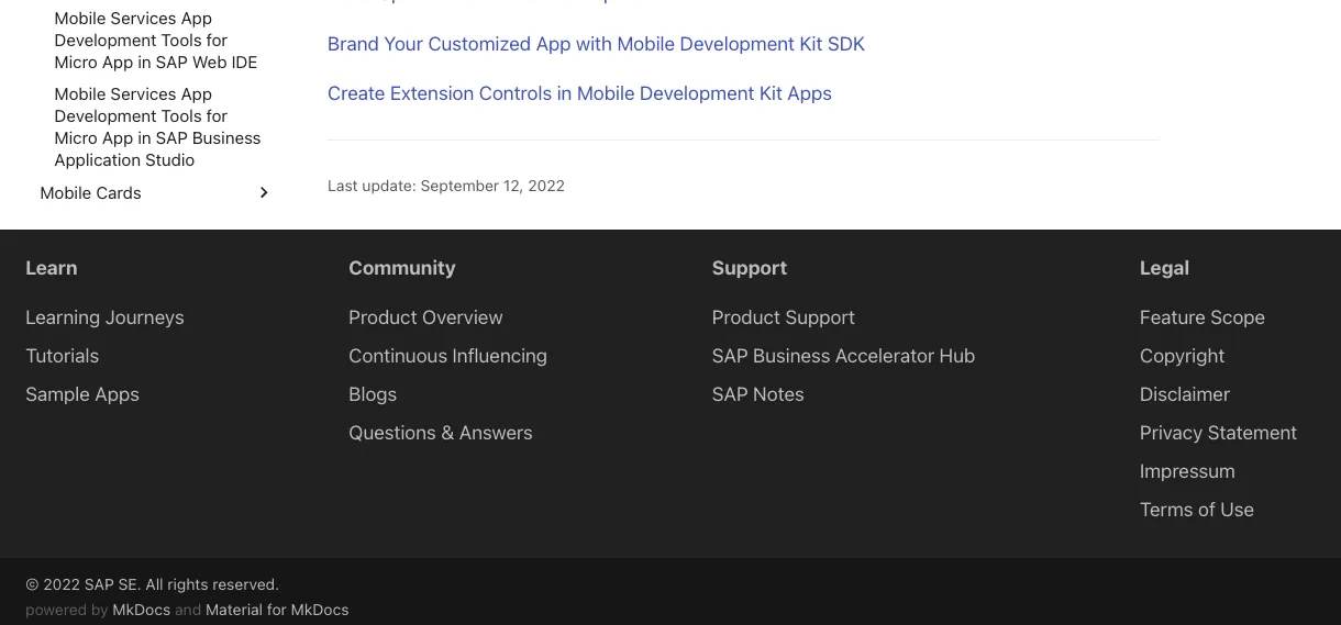 Notice the footer. No disclaimer, privacy policy, cookie settings or anything else. Compare it with the footer from the MDK SAP Help home page earlier: