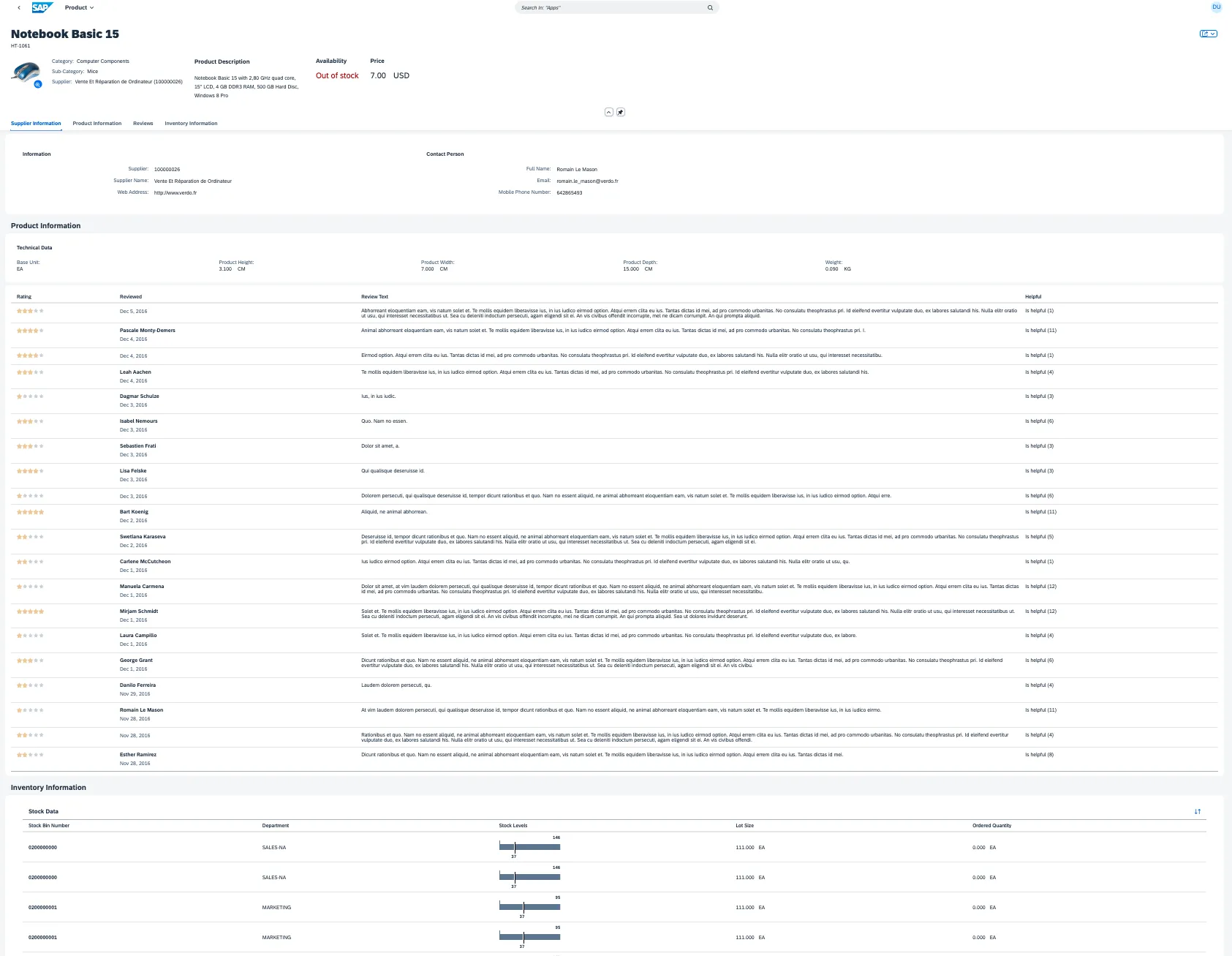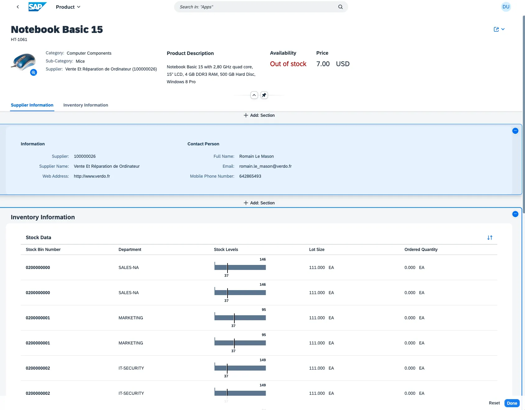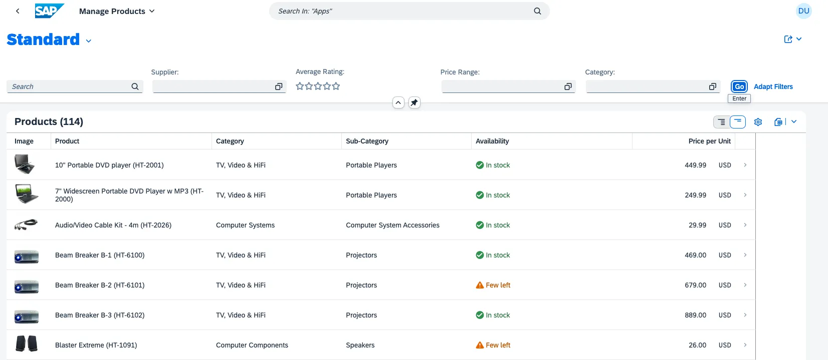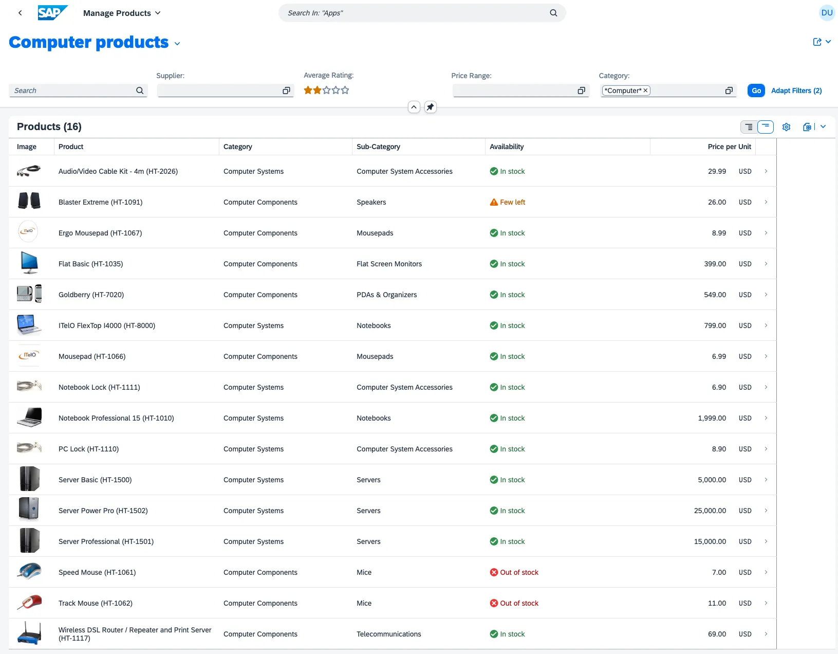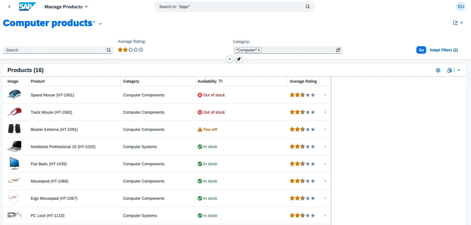 The manage products app follows the Fiori principles. As a result, it is a rather generic app for managing products. For the example, assume that the user is tasked with not only managing products in general. The task is to monitor computer products that are running out of stock or are sold out or that match a minimum rating.