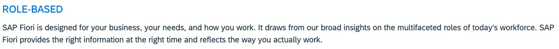 Why is this an additional principle? For the actual app that is delivered to the user, it is impossible to tailor the app to each and every requirement a user might have. For the role it is possible. This allows to focus on the role for app development. Role based allows to develop apps for a wide range of users, that can then adopt the app via personalization. The last step is highly individual, therefore “outsourced” to the user. Why is it important? The personal aspect is important. It is a unique differentiator for SAP Fiori.