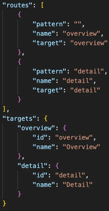 The code in the sample app for the routing part in manifest.json: