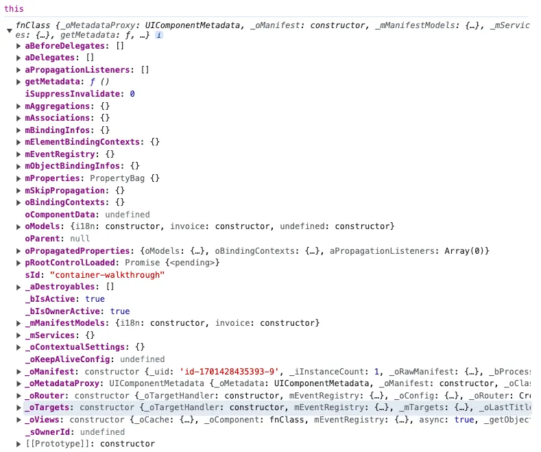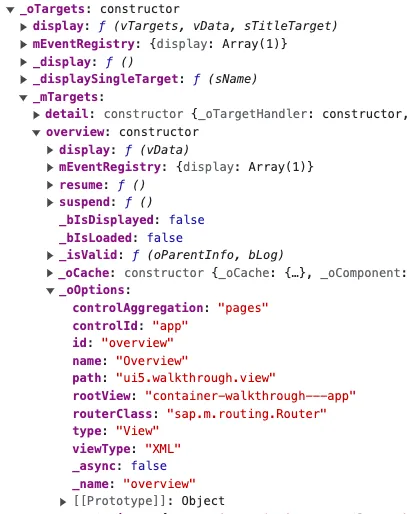 Why is this property needed? The error stated that for the target overview no viewName is defined. Yet, the working sample does not have this property set. At the working sample app, right before the router is initialized (this.getRouter().initialize();), I set a breakpoint. The same I did for the broken app. I looked at the available data.