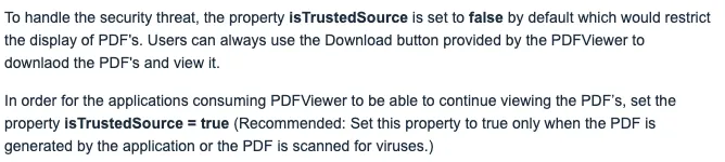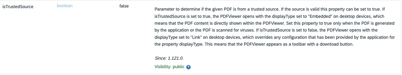 This is the breaking change: apps that showed the content embedded to the user won’t do this after the UI5 update. For the users, this is a breaking change. To have the old behavior, the newly introduced property needs to be set to true. This will open the PDF directly in the PDFViewer as it was the default behavior before the change. To solve this, developers need to adjust their app: include the parameter isTrustedSource and set it to true. This is a (rare) case where updating UI5 includes adjusting UI5 apps to have the same behavior as before.