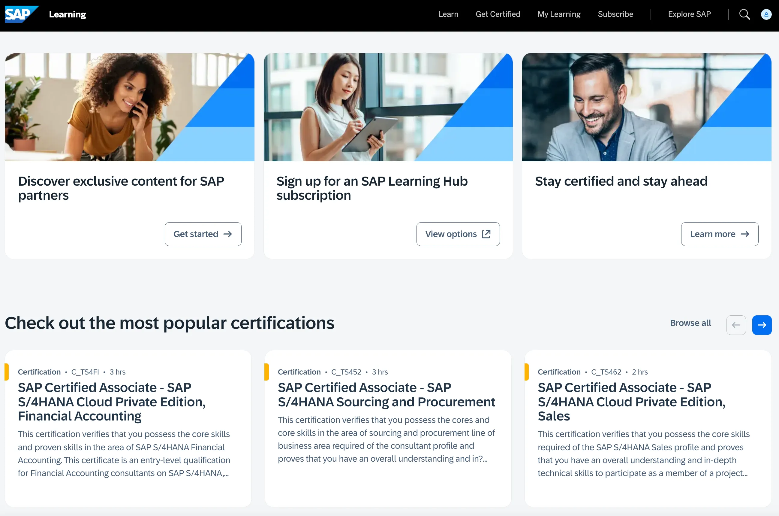 Let’s start at SAP Learning 🔗. On the start page the value of certification is advertised, as well as popular certifications (because: get certified in what is popular, not what fits your needs, right?).