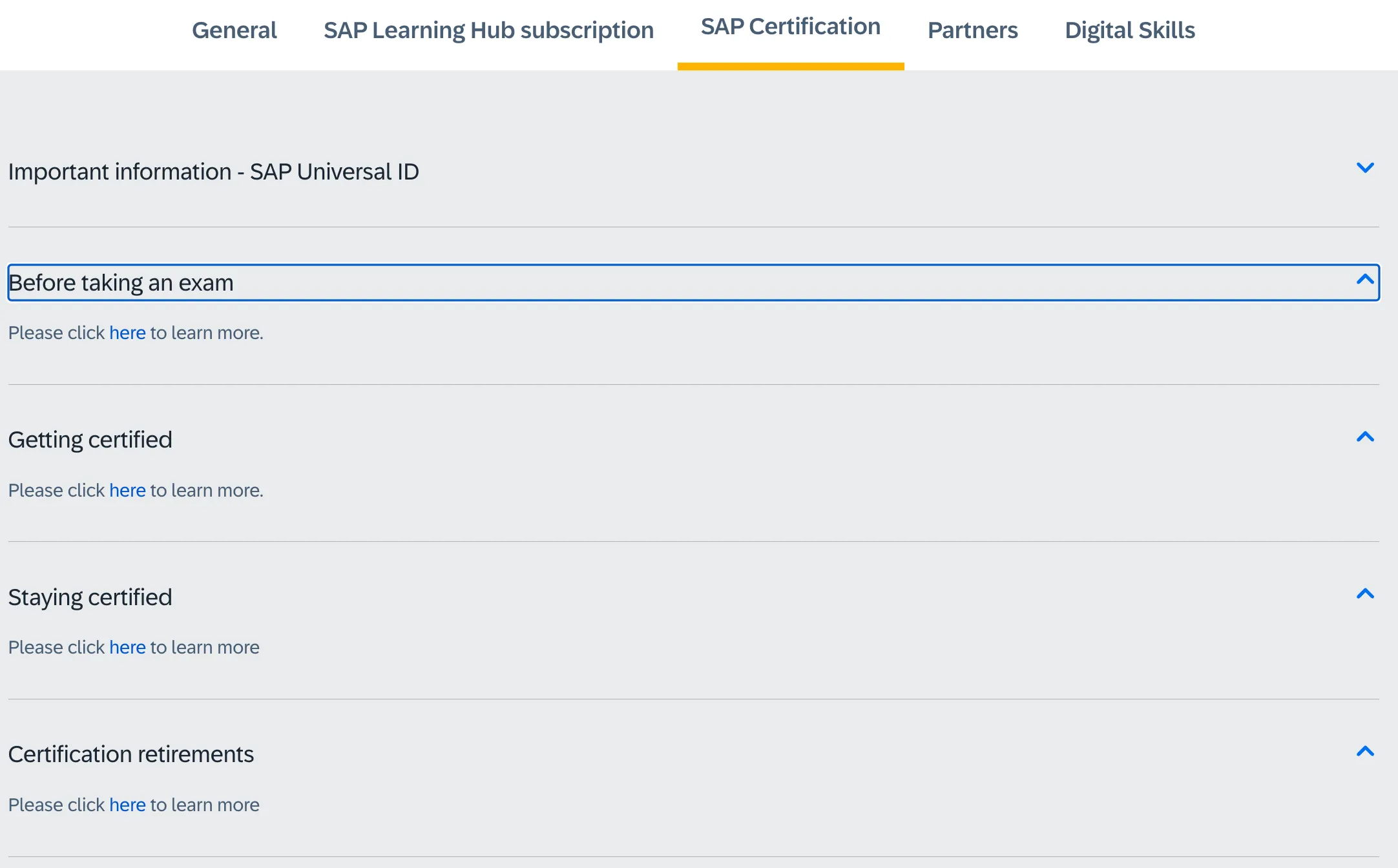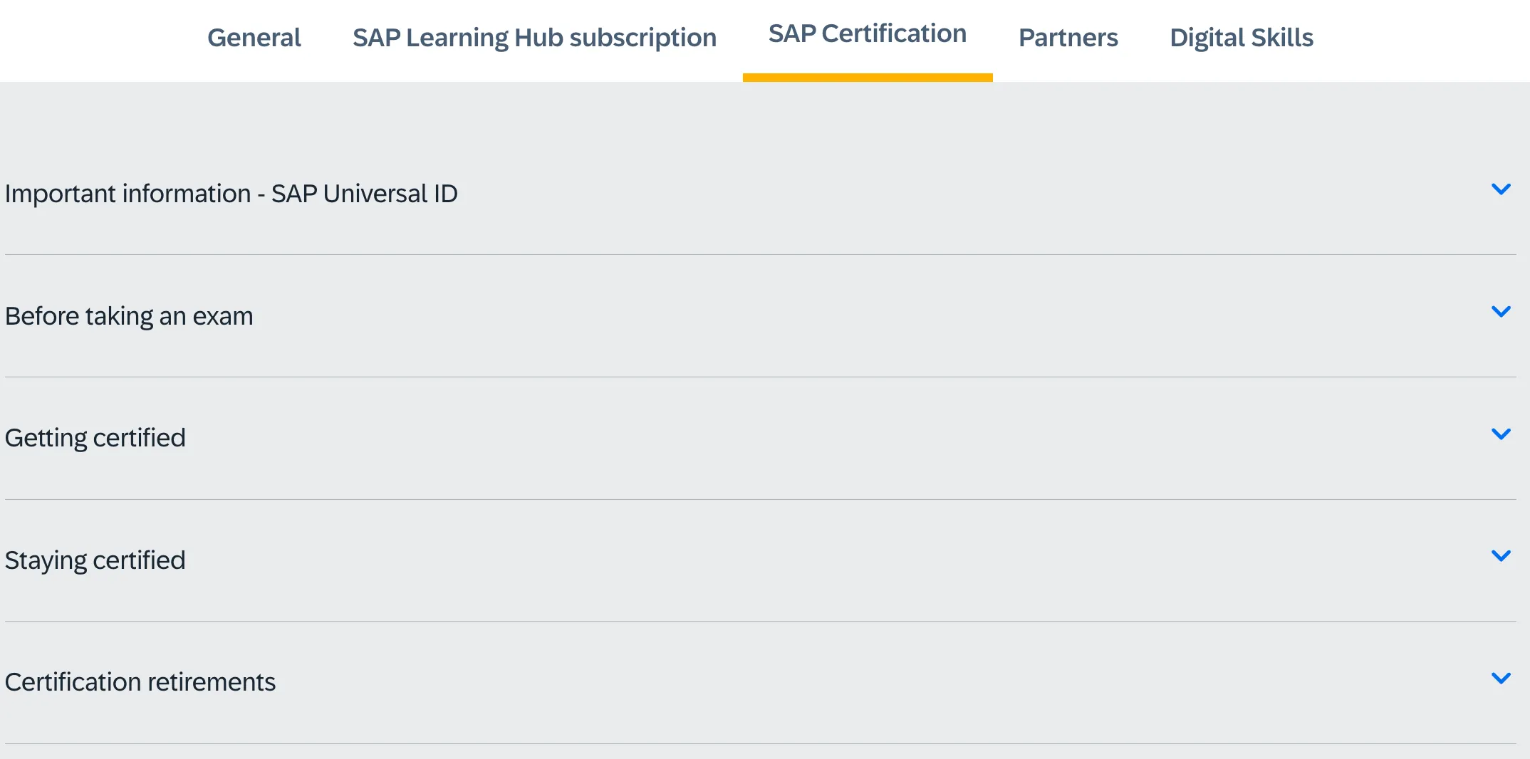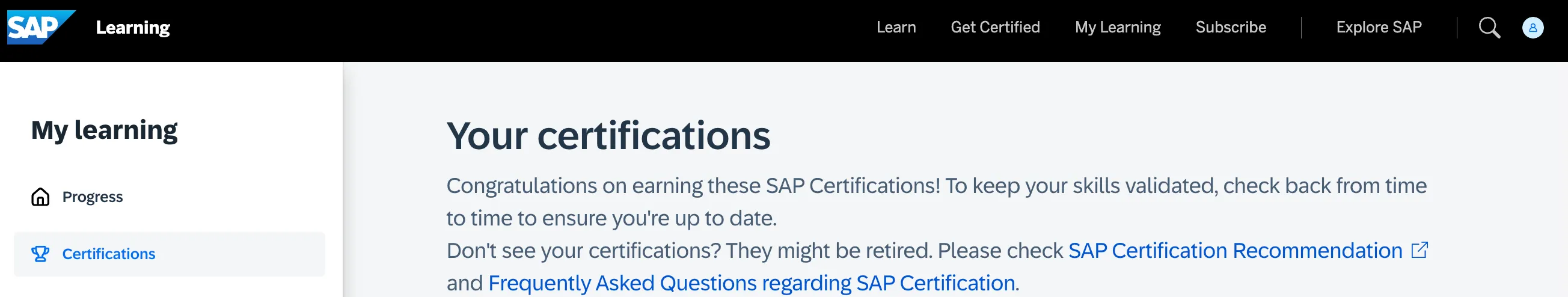Going for the “Stay certified and stay ahead 🔗” link shows a nice overview page about SAP certification. The question on how to get and stay certified is answered there: