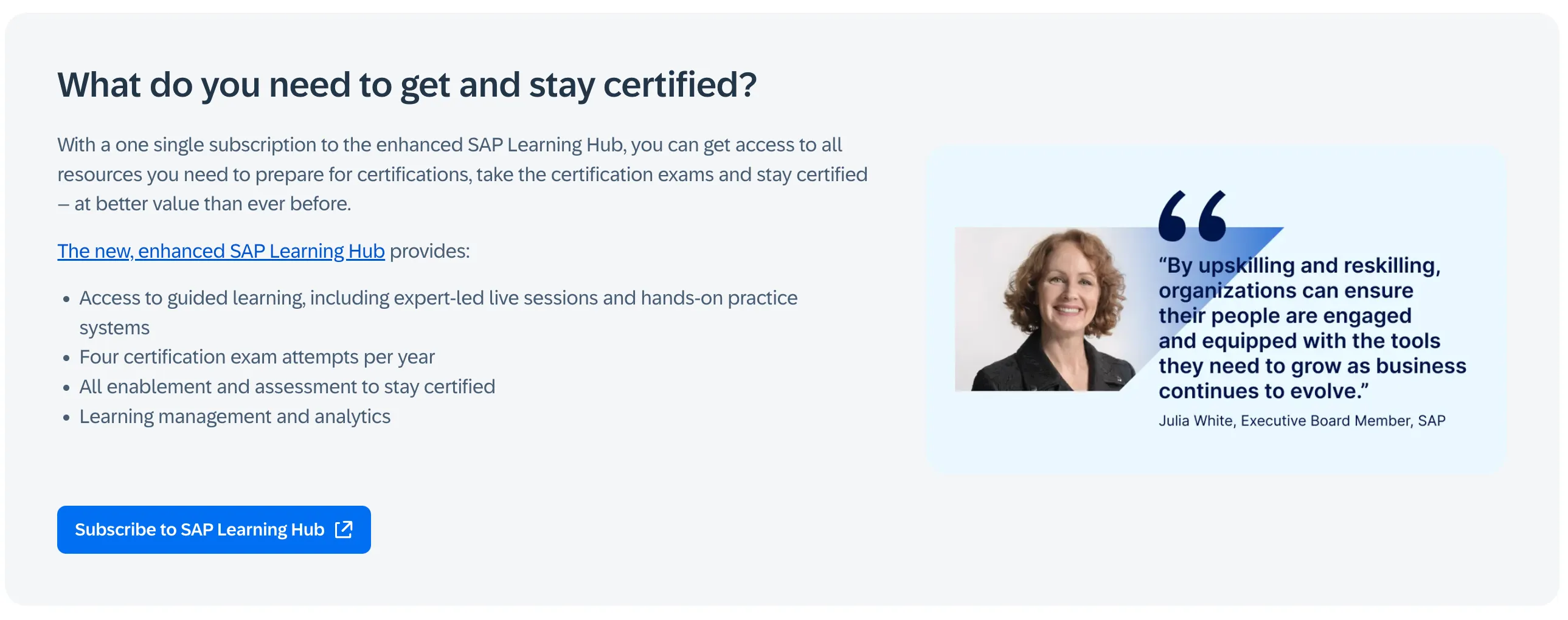 The important part here is: “Please make sure you have a subscription to SAP Learning Hub to get and stay certified”. Get and stay certified. Most important: subscribe to SAP LH to GET certified. No SAP LH subscription, no certification.