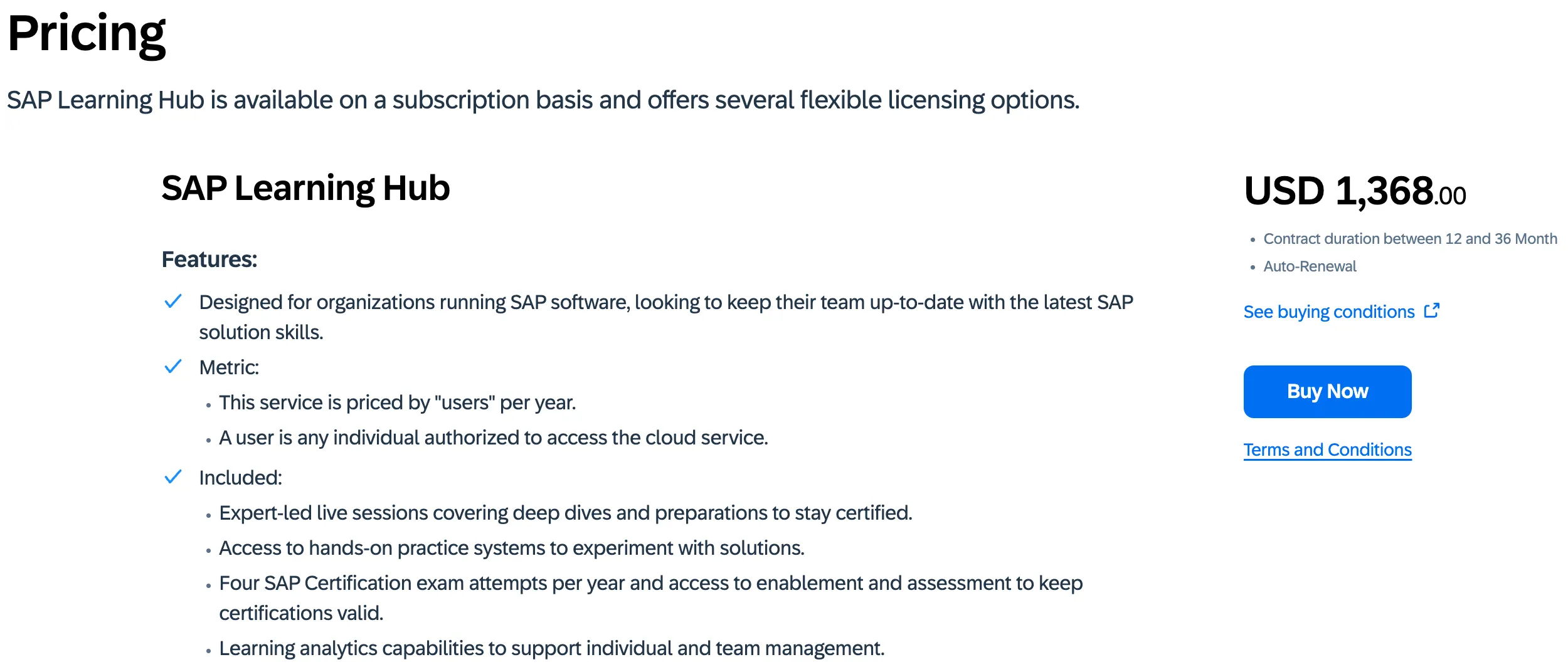 To get certified, it is suggested to buy either SAP Learning hub or a partner edition. The “Buy SAP Learning Hub” opens the Learning Hub pricing section 🔗. The same 1,368$ as above.