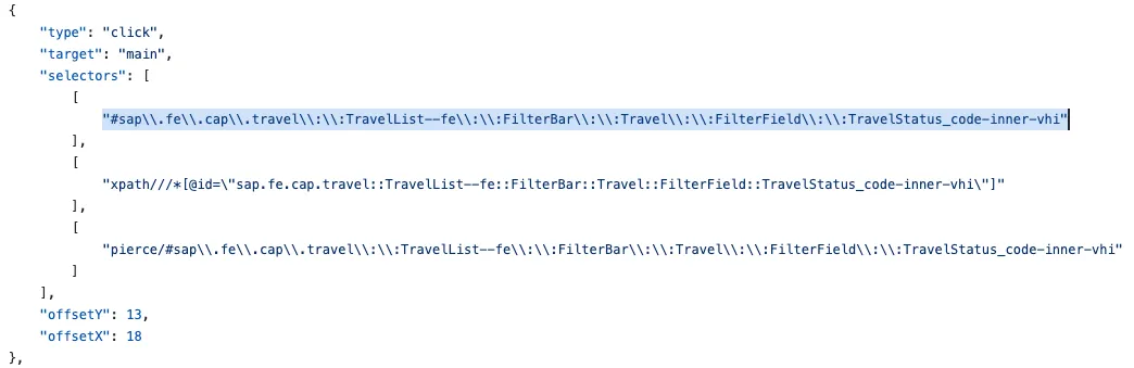 The ID to use is #sap\\.fe\\.cap\\.travel\\:\\:TravelList—fe\\:\\:FilterBar\\:\\:Travel\\:\\:FilterField\\:\\:TravelStatus_code-inner-vhi.