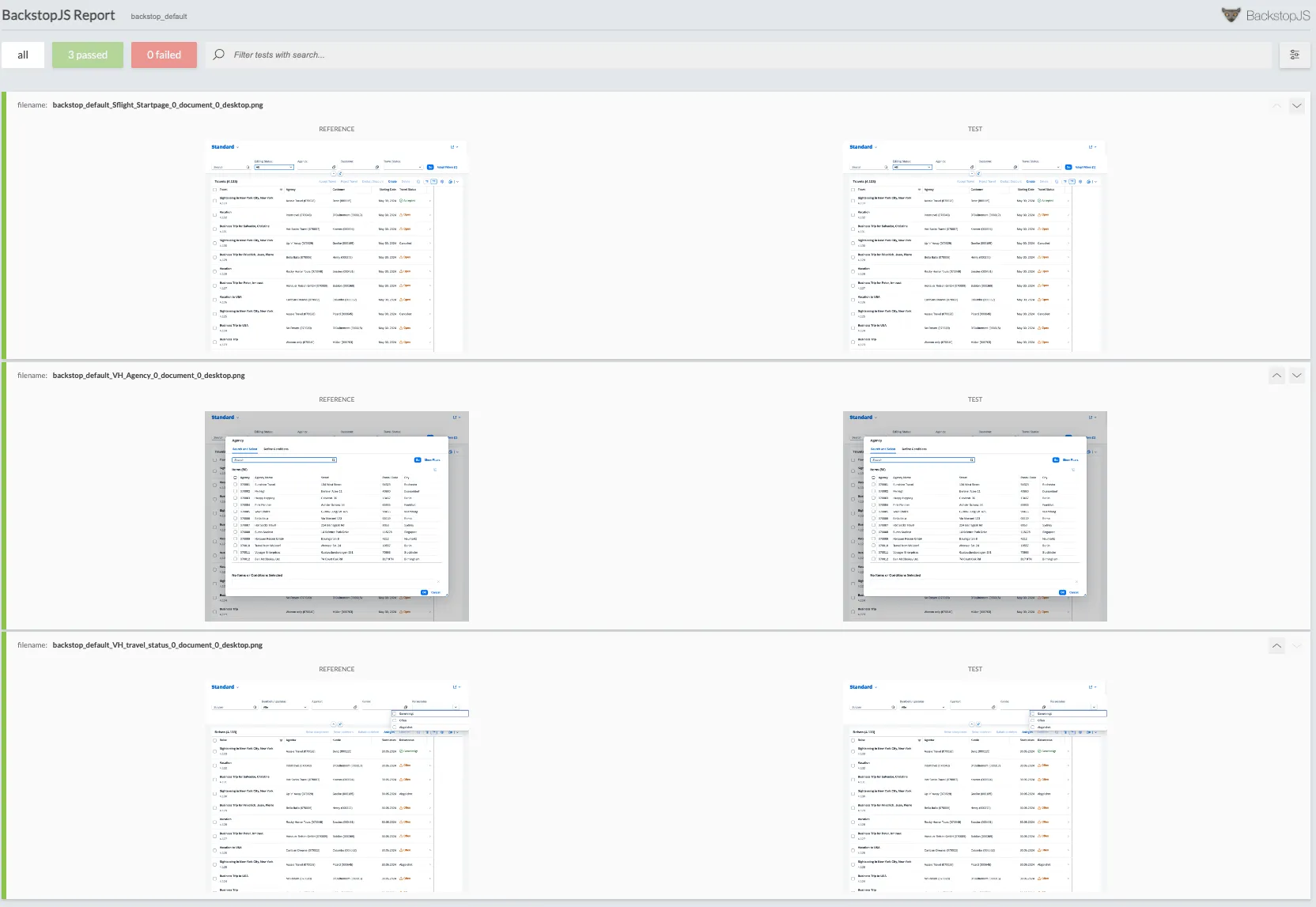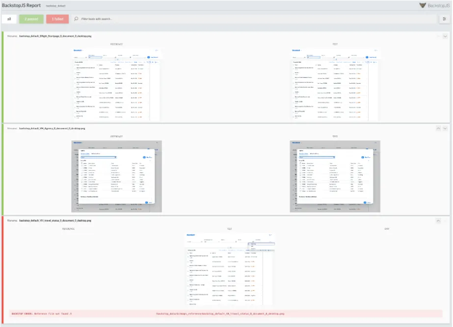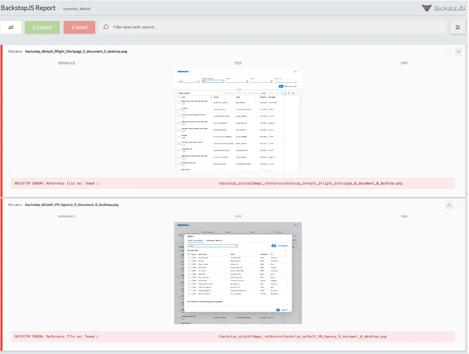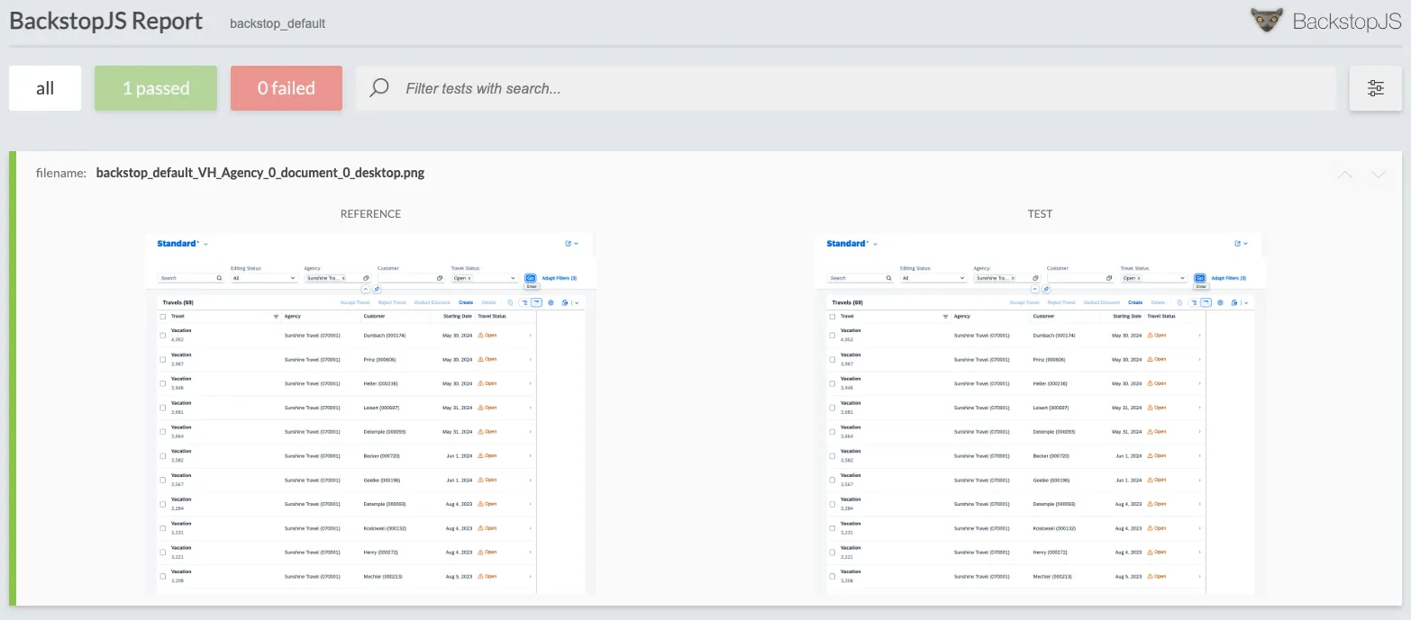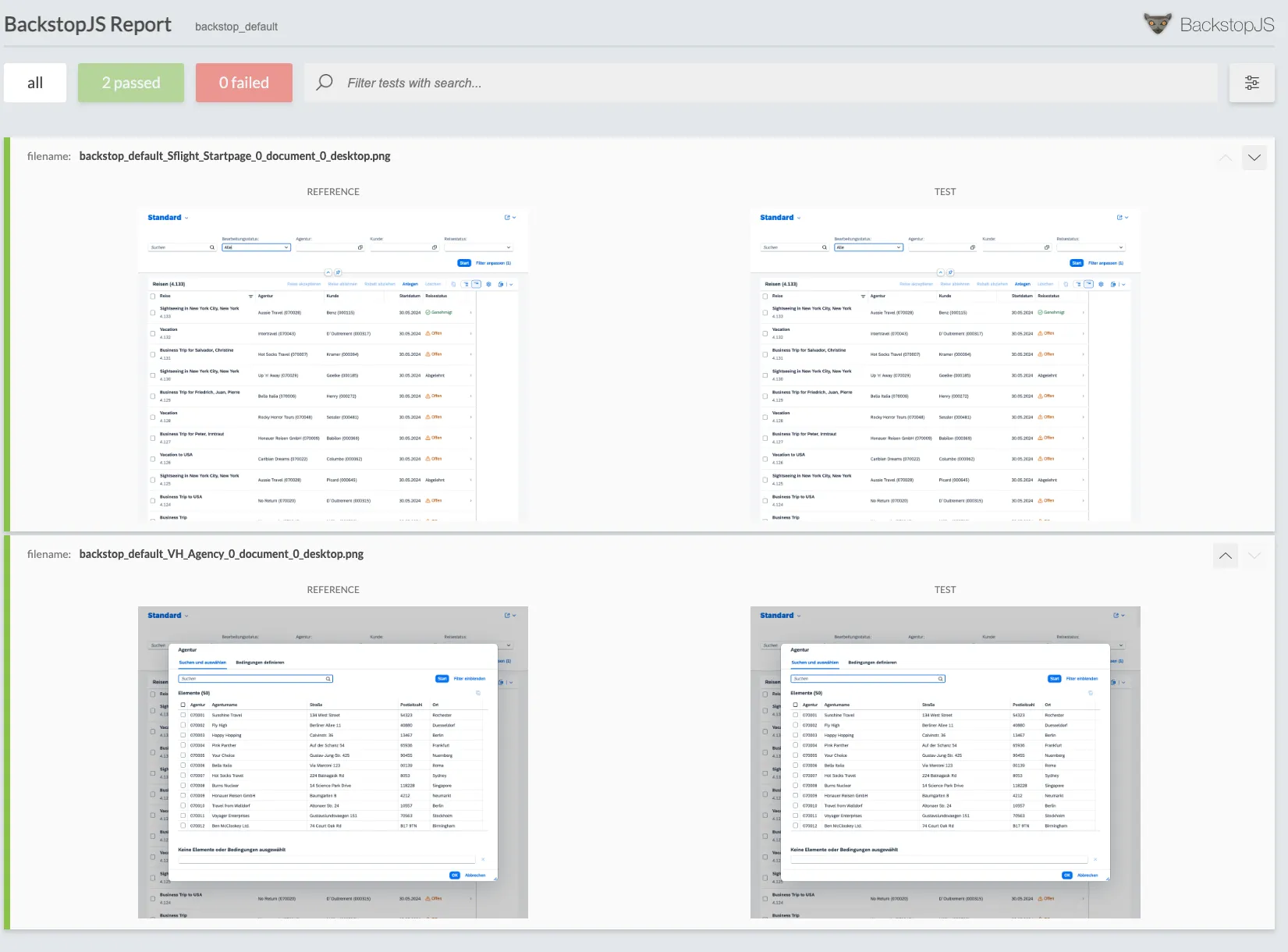 Step 5 is where the visual testing approach reaches the limitations. To enter the filter values, a set of actions needs to be performed. Open the value helps for two filters – agency and travel status – and select a value from the dialog. Out of the box, this complex interaction is not possible using BackstopJS. While you can provide several elements to click on, those are executed directly one after the other. The click action on the agency value help might be performed first, but the click action on travel status is performed right after, making the app only show the travel status value help. The idea of BackstopJS is to capture a screen state, or to run some actions to reach the state like navigation, triggering input validation message or expanding an area. The goal is not to replay a complex user interaction flow. There are other tools for that (I’ll describe this approach in a later article in my blog).