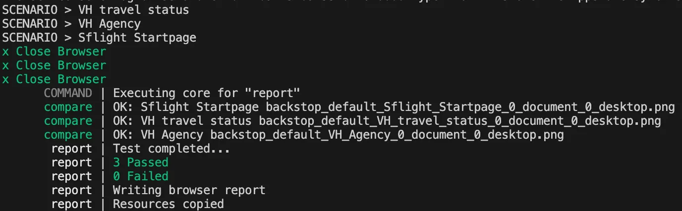 Running the tests executes the same tests as in step 2 again. The test will report no error, as the app wasn’t changed between test runs. The important part of step 3 is very simple: a test is configured taking the direct input of a user recorded test. It is not the developer that took the ID needed to trigger the agency input field value help. This ID was provided by the provided test recording. The ID was only taken as input for the visual regression test by the developer.