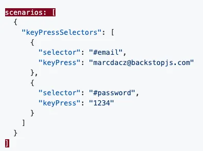 These actions can be added to the visual regression test using copy & paste (you’ll only have to adjust the \ to \\). The test configuration in backstop.json will include the new keyPressSelectors values and the clickSelectors for triggering the search.