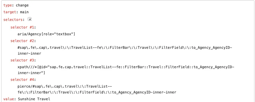 The recording for the filter agency looks like this: the input field is selected by ID, and the value of it is changed to “Sunshine Travel”.