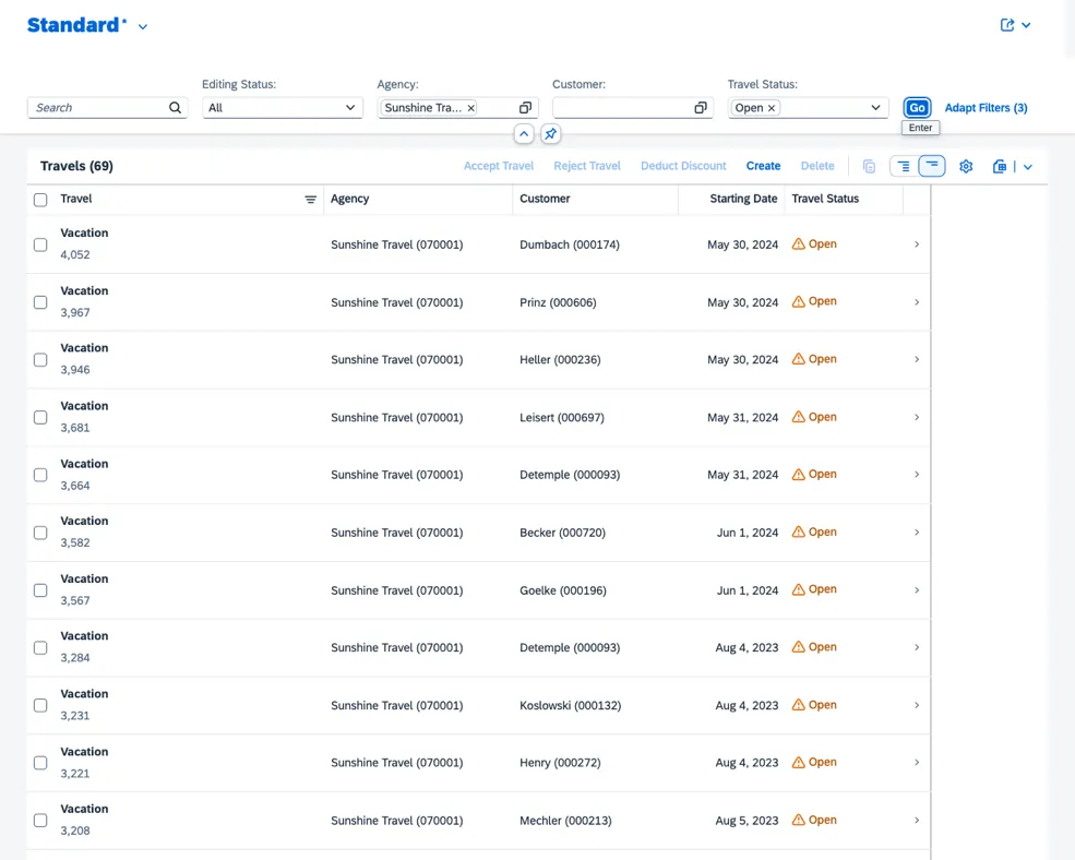 The report shows the expected result. The table is filtered for agency Sunshine Travel and travel status Open.