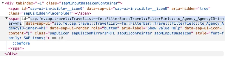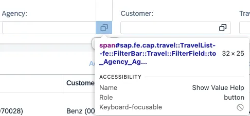 In the HTML code the ID of the value help is shown as: sap.fe.cap.travel::TravelList—fe::FilterBar::Travel::FilterField::to_Agency_AgencyID-inner-vhi