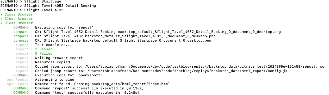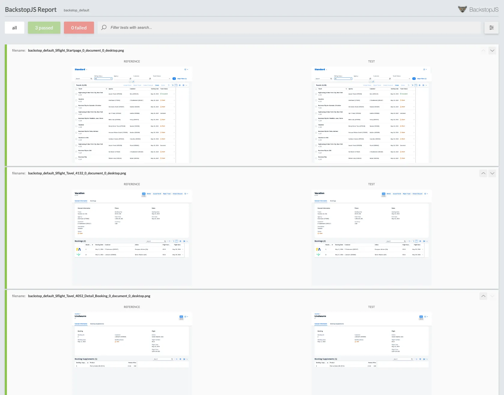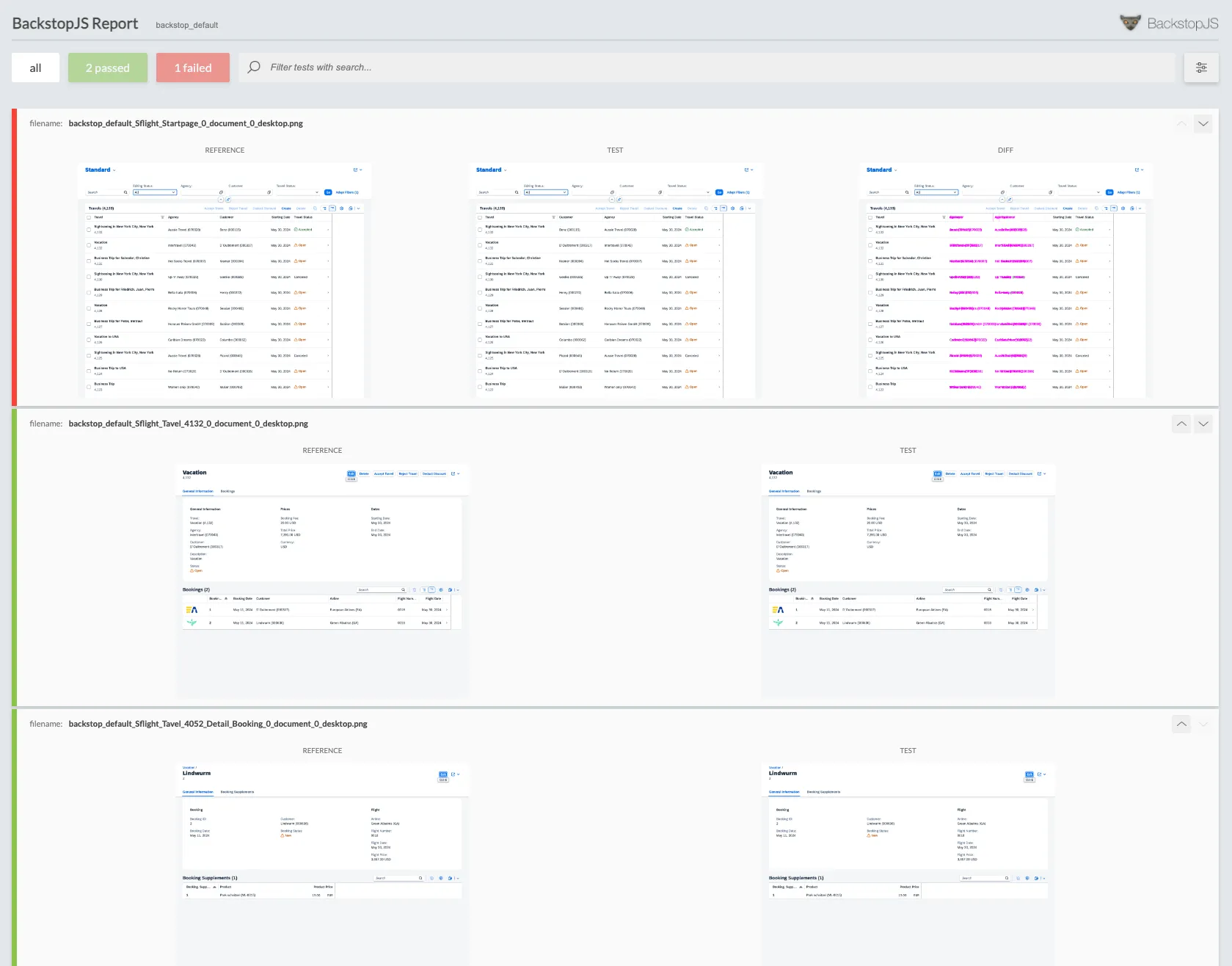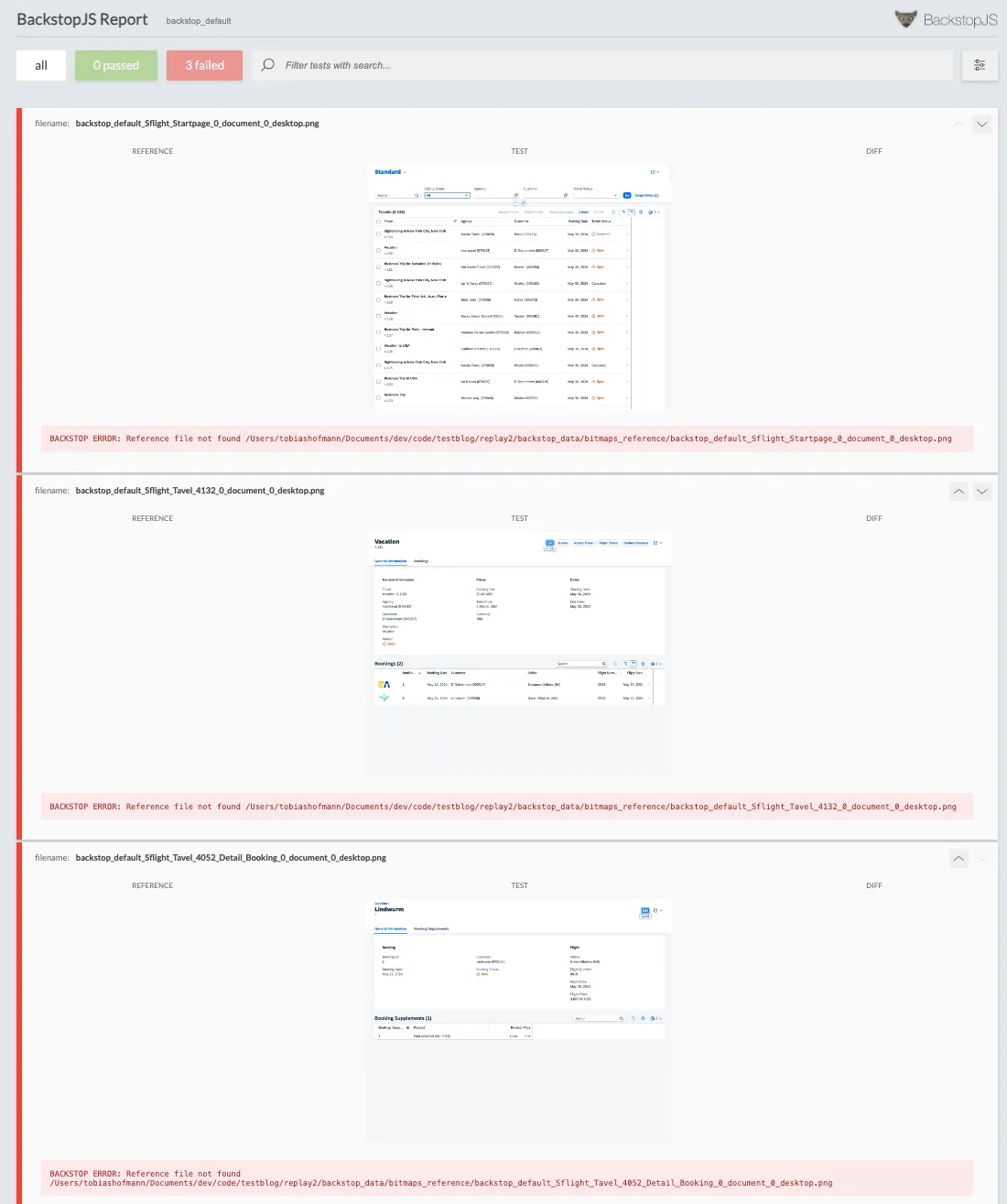 The results of each test run are stored also in the backstop_data directory. This allows to check for each test run the captured images. The report can be accessed manually by opening the file /backstop_data/html_report/index.html in the browser.