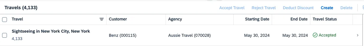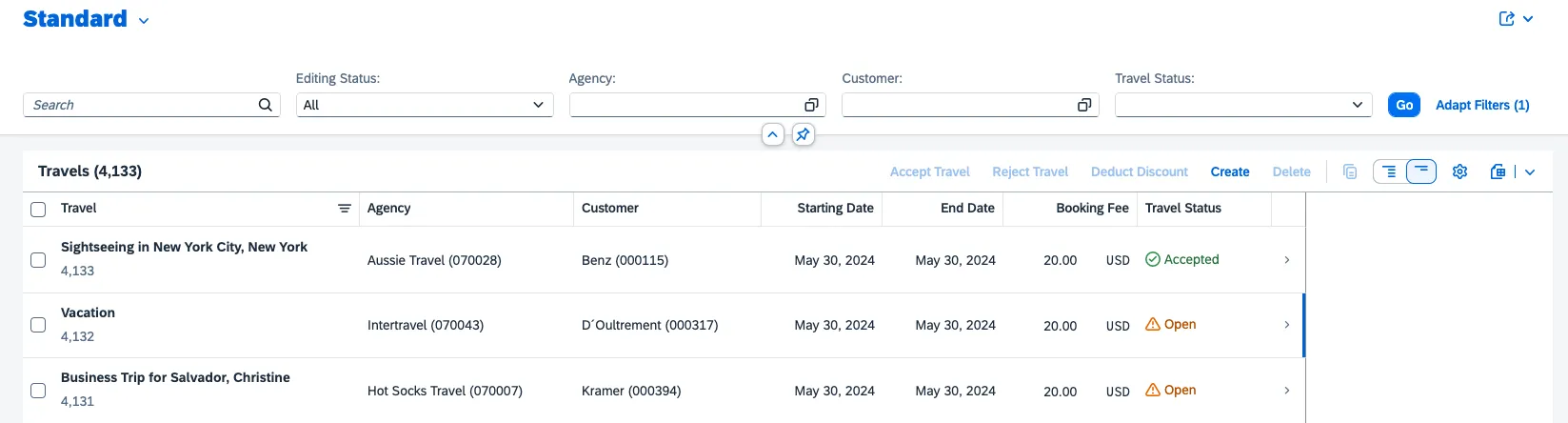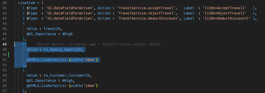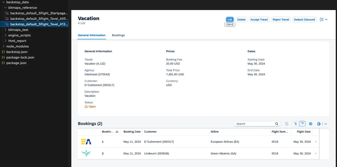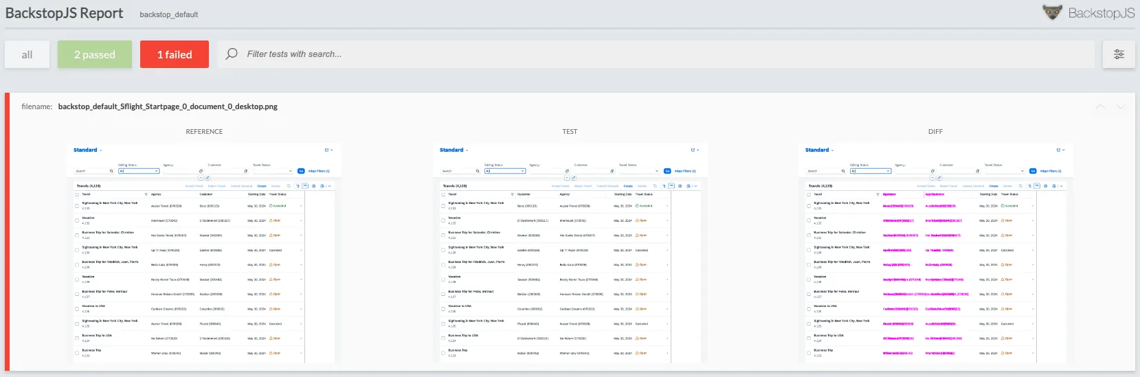 In case the captured image of the app during a test run differs from the baseline, BackstopJS will report this. To simulate an UI change, letβs change the app under test. Move the agency column in the main table after the customer column. This is done in the project cap-flight. The CDS file app/travel_processor/layouts.cds must be changed.