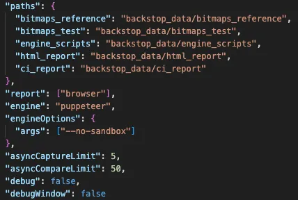 This will install the BackstopJS specific files in the project. The folder backstop_data is used to store test data and contains helper scripts for running the tests. BackstopJS supports Puppeteer π and playwright π, and for both it comes with helper scripts. The file where the tests are specified is backstop.json. It is a JSON file that configures Backstop and contains all testing scenarios. Out of the box, a test against the BackstopJS website is included. Configuration for paths, engine, limits or debug are all in the backstop JSON file.
