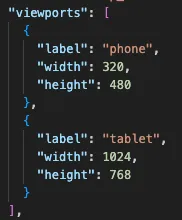 After initializing the BackstopJS project the first UI tests can be added. The current configuration after project initialization is to test for tablet and phone resolutions. These are defined in the viewports property of the backstop config file. The values can be freely chosen.