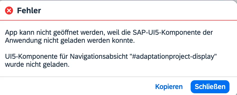 Message in German. It states that the application cannot be opened as the UI5 component cannot be loaded. The intent #adaptionproject-display is not working.