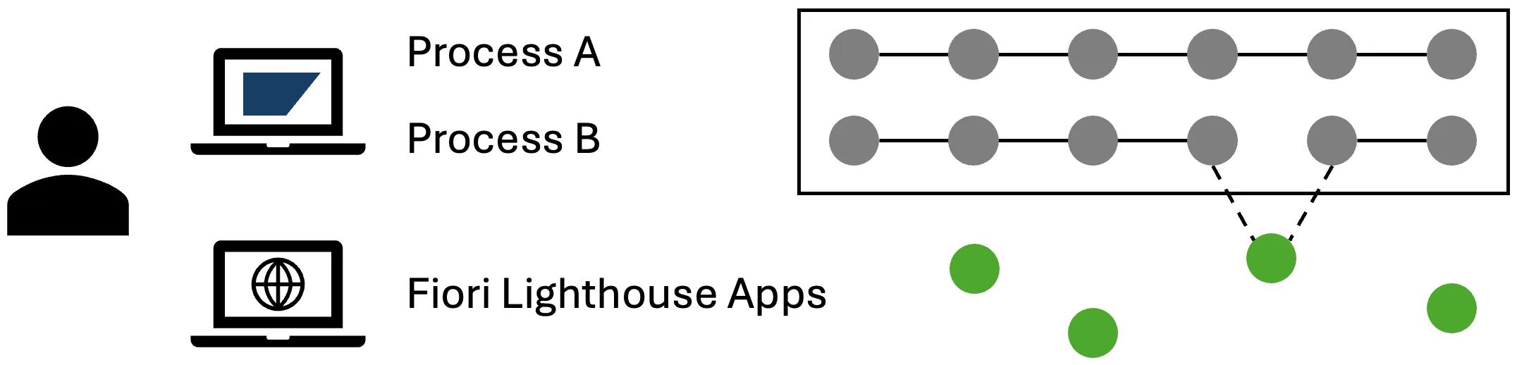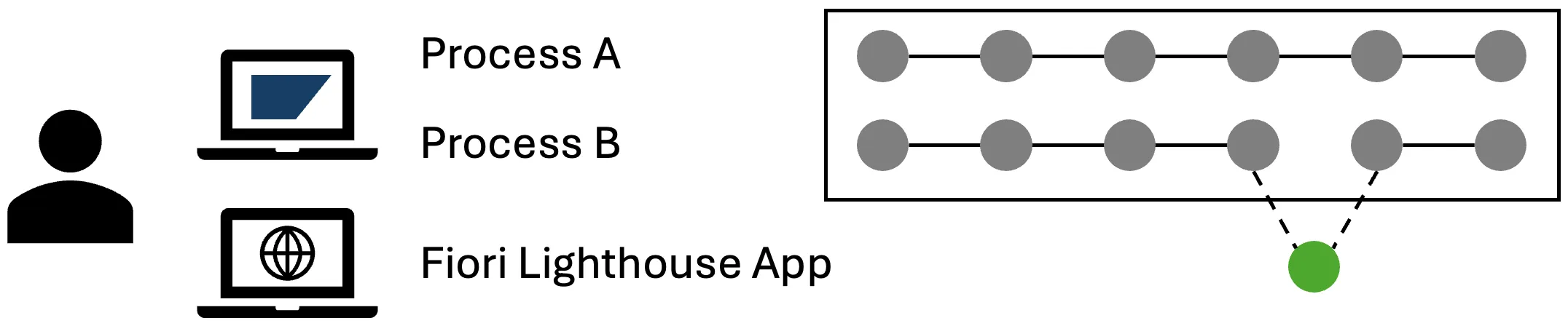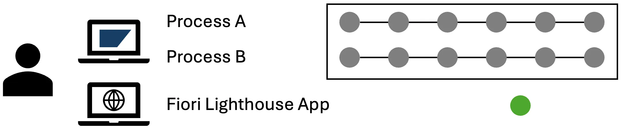 Process A and B are SAP Gui based in SAP system A and B and are what the user must work with daily. The Fiori app is available in a new S/4HANA system with access via SAP Build Work Zone đź”—. The user has no direct benefit from the Fiori app regarding their daily work done in processes A and B. Instead, a new system and client (web browser vs. SAP Gui) was introduced. The user might be able to run the app from a central launchpad, like SAP Build Work Zone. For running process A the user must still use SAP Gui and log on to system A, while for process B a logon to system B is needed. Resulting in the fact that the user has 3 systems to use to run all apps.