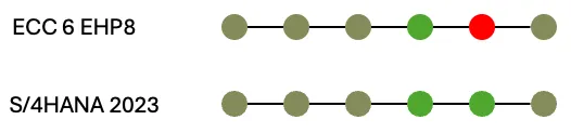 Specially the custom developed apps are a challenge. In the graphic below a process in ECC 6 EhP8 has 4 custom developed apps, one Fiori app (green) and one standard transaction (red). While the one transaction can be transformed to Fiori in S/4HANA 2023, this is not true for the custom apps. These are either not covered 1:1 by SAP or there is no easy replacement available.