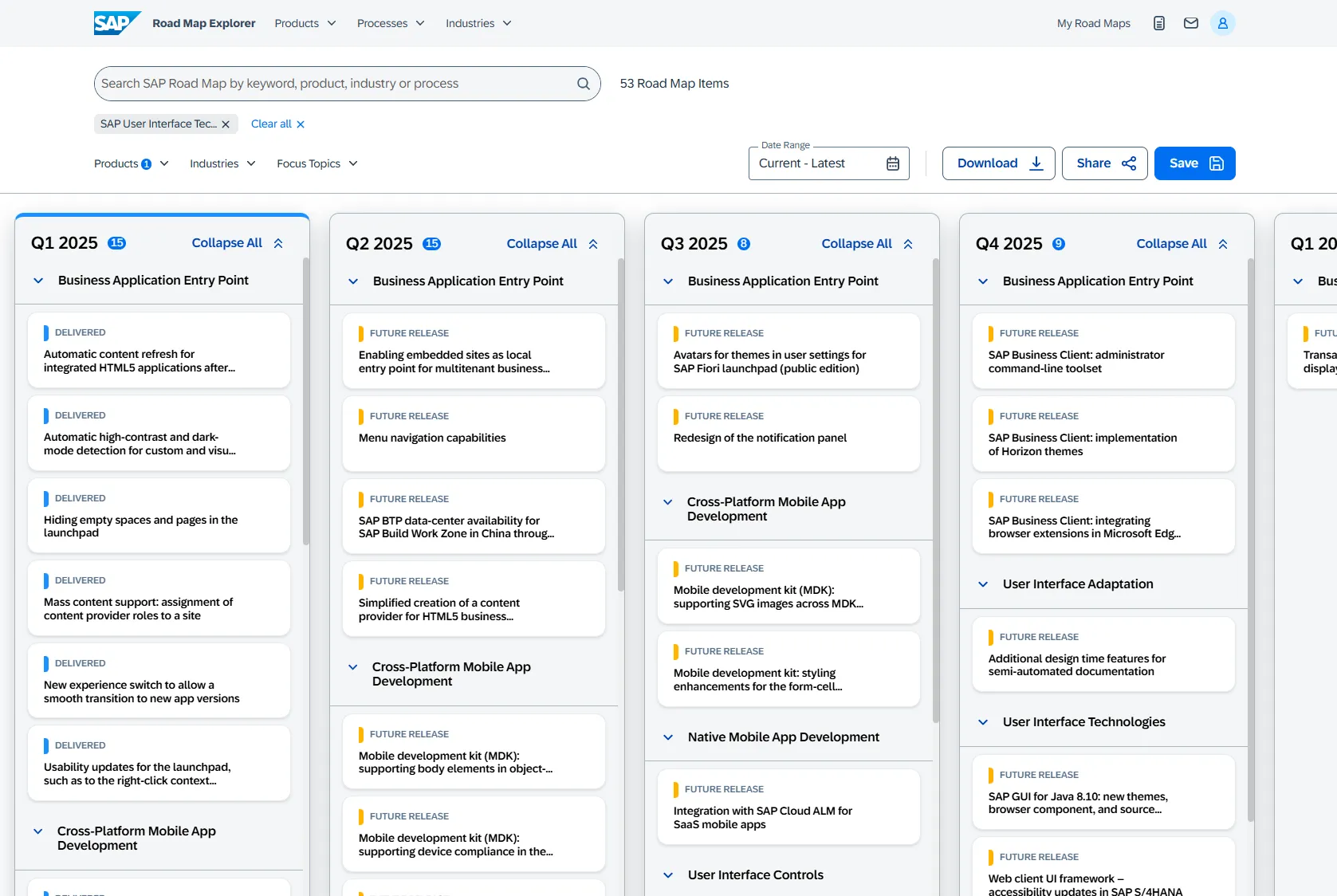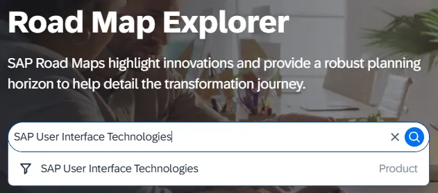 The SAP Road Map Explorer gives you the option to explore the roadmaps by product or industry (and processes, but only from the top navigation). The option to explore the roadmaps by technology is not offered. For this, you need to use the search box. Enter your technology, e.g. SAP User Interface Technologies and start your search.