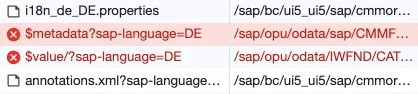 Loading the app and looking at the network trace of the browser shows that the requests to the OData service in the backend fails.