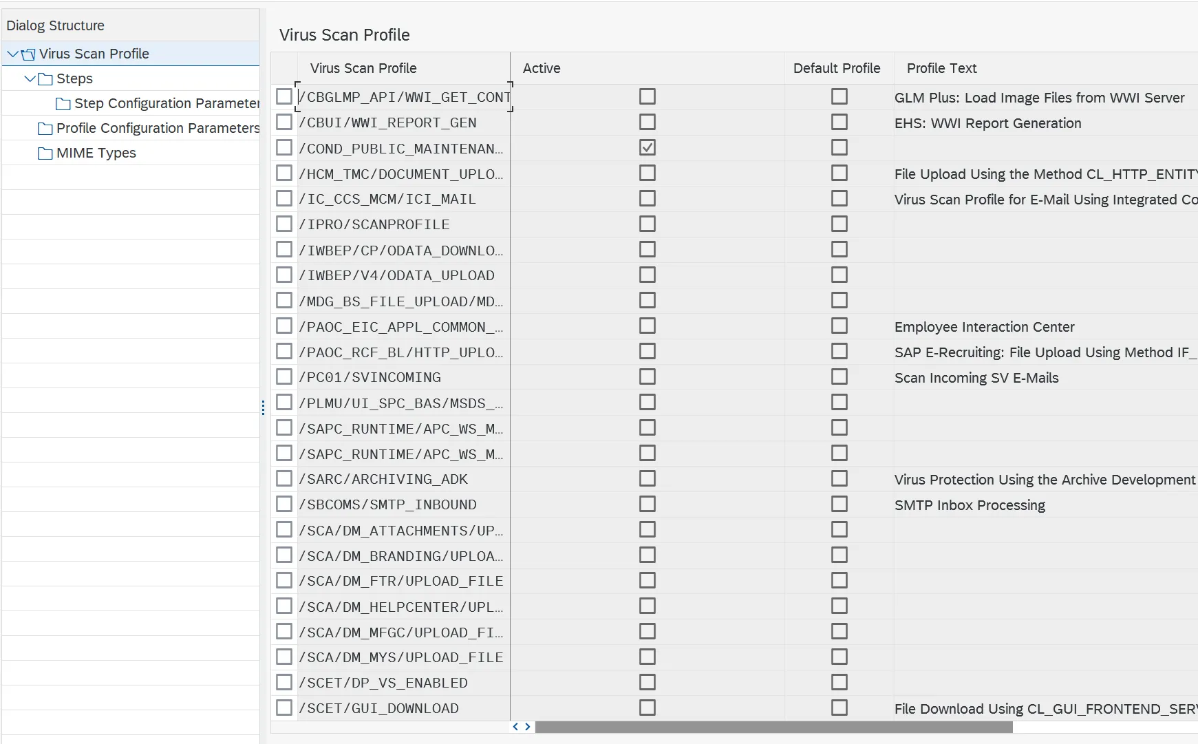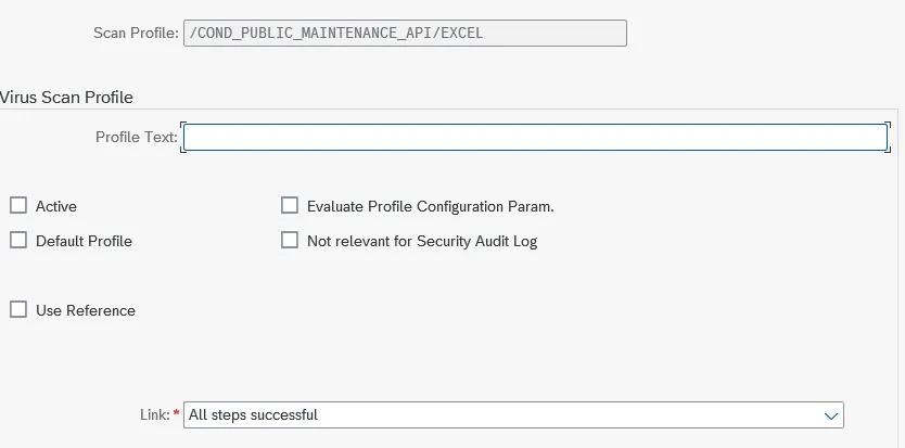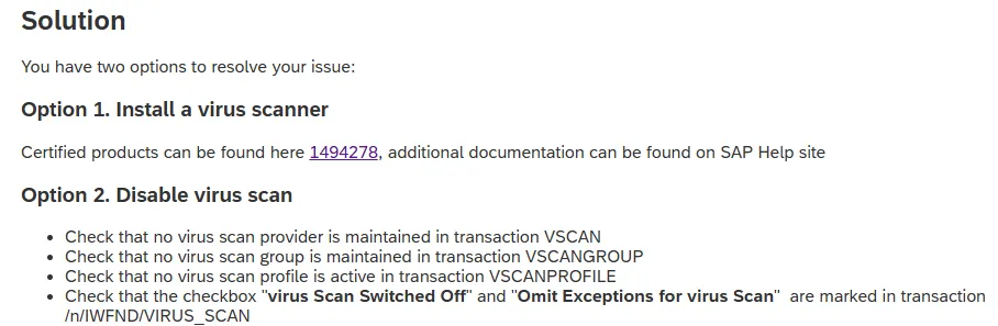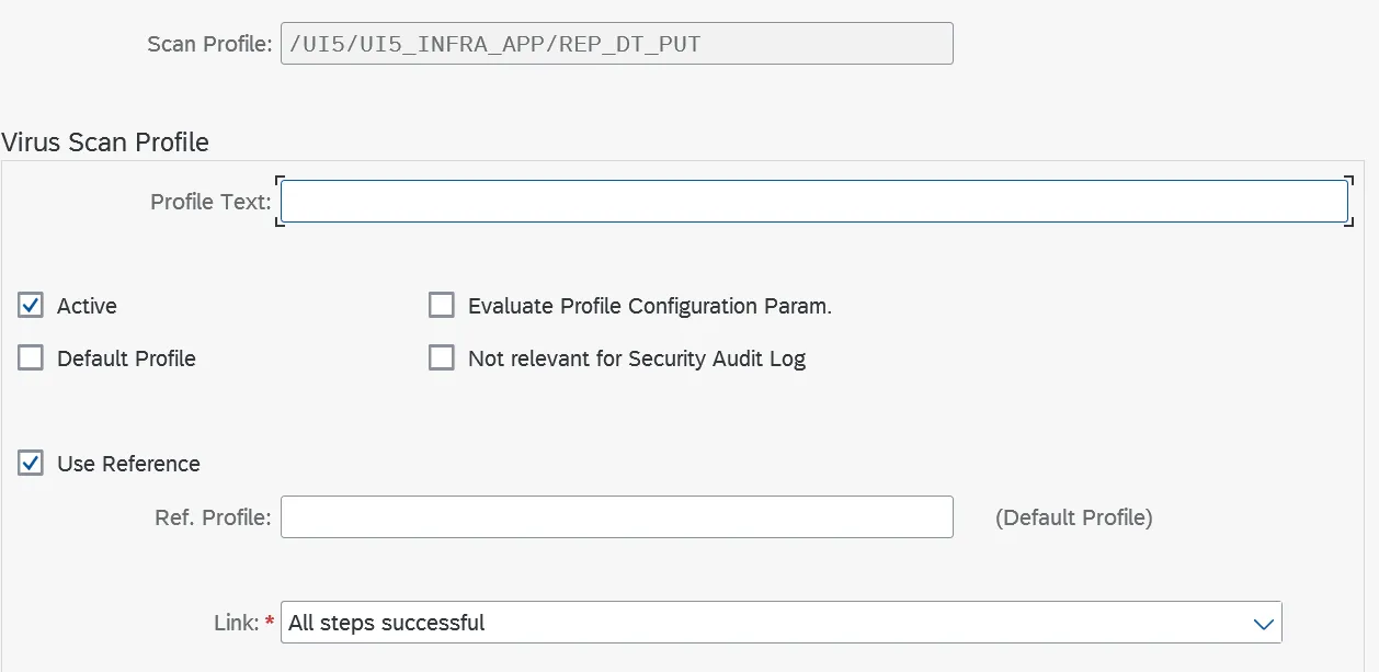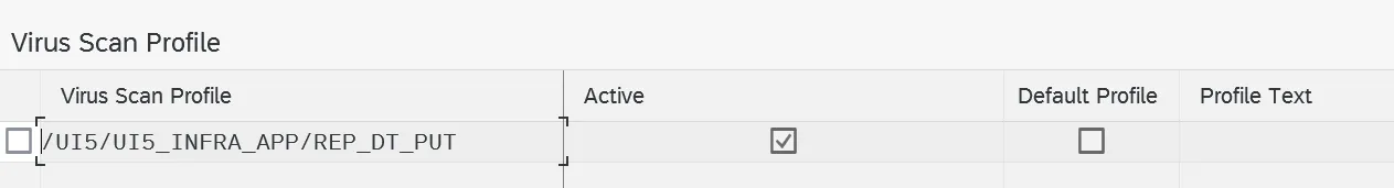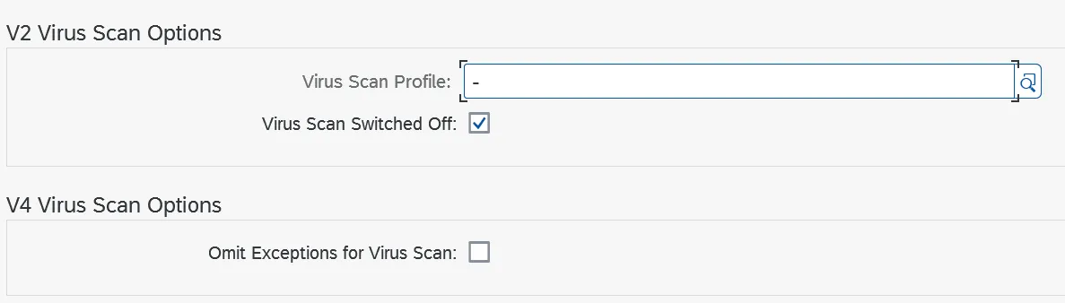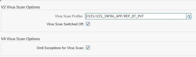 Scanning for virus is disabled for OData v2 services. However, a scan profile is set. Normally, all you need to do is to turn off virus scan to be able to upload an app. The checkbox to turn off virus scanning is checked: no virus scanning (who came up with checking the checkbox to turn it off?). In my case, while scanning is turned off, a scan profile is set. Normally, with scanning turned off, the screen looks like this: