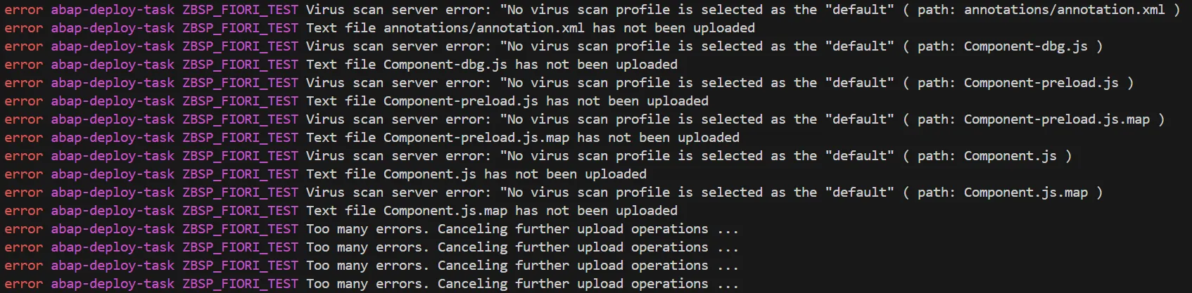 In case deploying a Fiori app via the Fiori tools fails due to an active virus scan profile, it is normally sufficient to deactivate virus scanning. In my case, virus scanning was turned off, yet the deploy continued to fail because of a missing default virus scan profile.