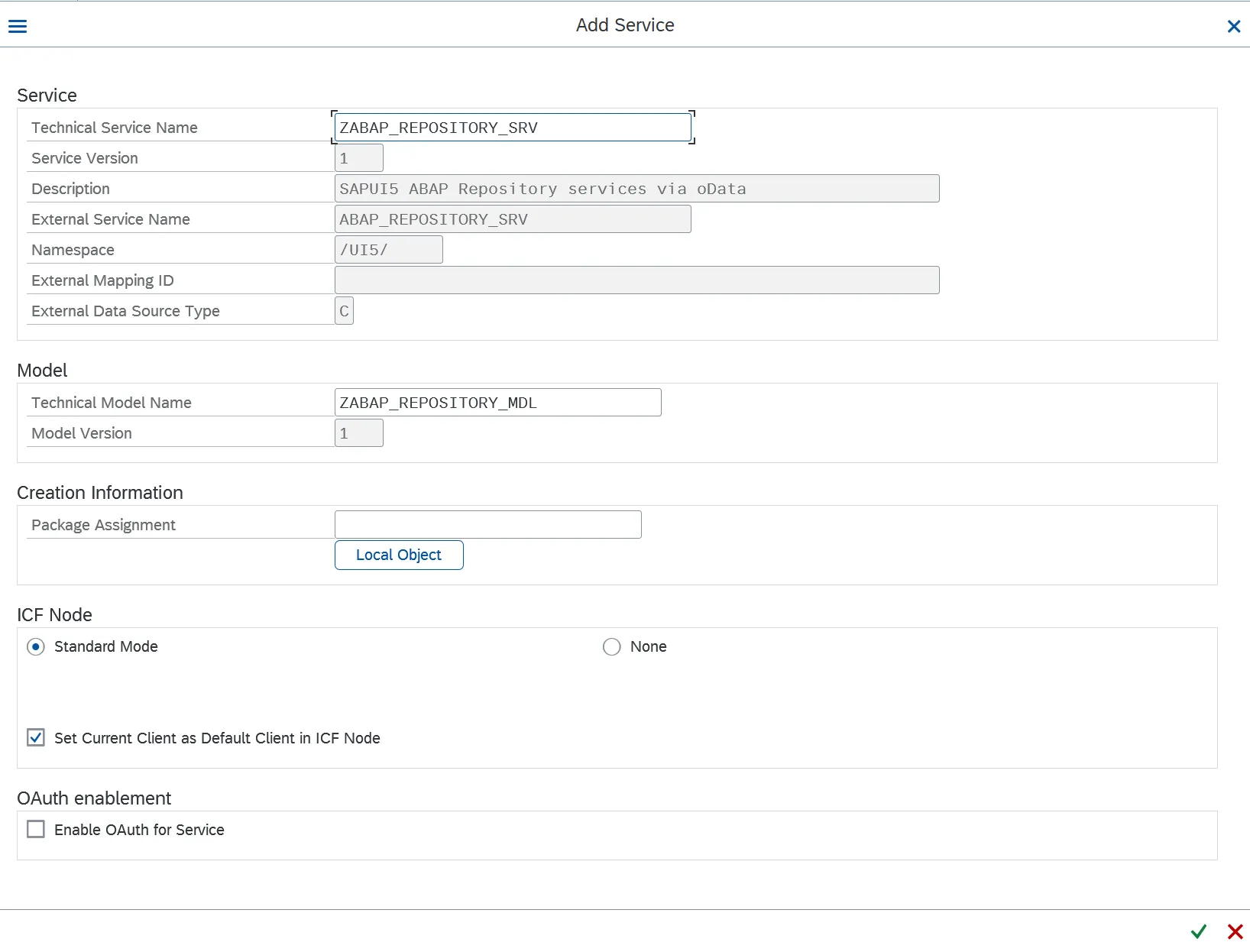 If you do not want to have this service transported – to let only deploys happen in this system, e.g. DEV – give as package $TMP.