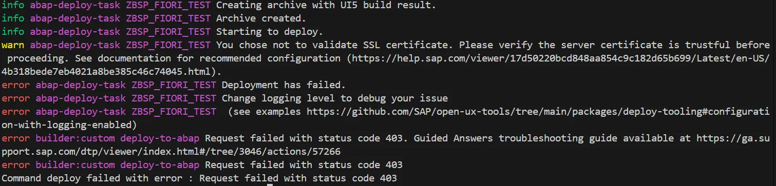 You want to deploy a Fiori app using the Fiori tools. Running fiori deploy fails with an HTTP 403 error.