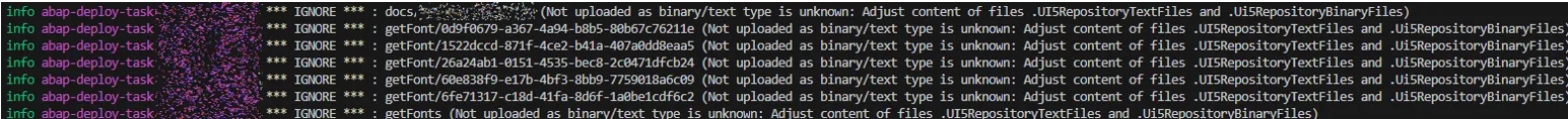 In case you have added a binary file like a font or a plain text file without any suffix to your Fiori app, the deploy will fail. This is intentional. For a file that is using an unknown suffix like .xyz, the upload is blocked. The repository where the Fiori (UI5) files are stored supports a given list of files 🔗. Uploading any file to it might not be what you want. This mechanism is preventing you to upload any file to the UI5 repository.