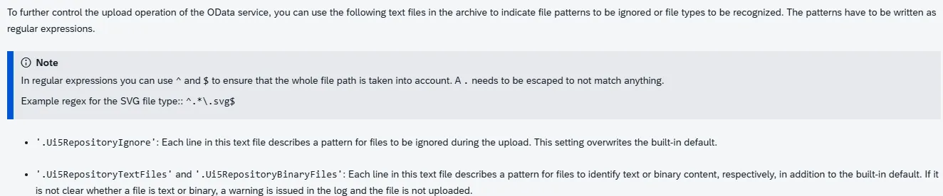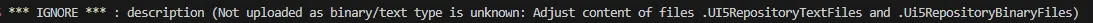 The files ‘Ui5RepositoryIgnore’, ‘.Ui5RepositoryTextFiles’ and ’.Ui5RepositoryBinaryFiles’ can be used to indicate patterns to ignore or add files. To add a file pattern, use .Ui5RepositoryTextFiles for text files and .Ui5RepositoryBinaryFiles for binary files.