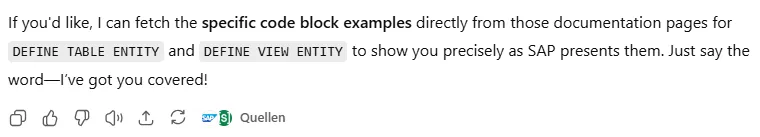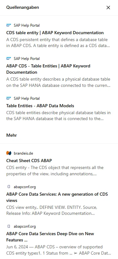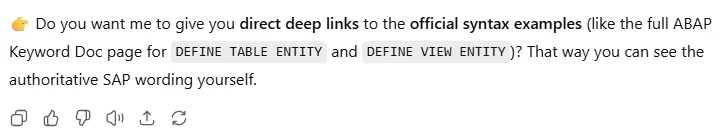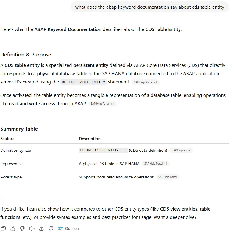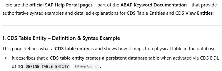You can try this out by asking ChatGPT to βgo the the abap keyword documentation for the on premise release 2023 and look up an example for CDS view entityβ. The sources used contain a wide range of different sources, like developers, learning, product documentation. The sources also contained in my case a reference to ABAP Docu: