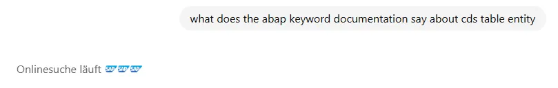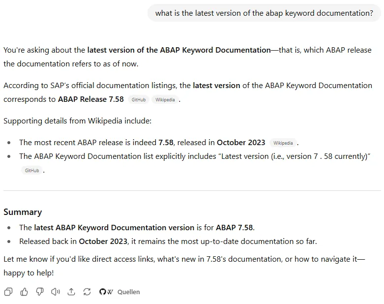 The chat bot searches the internet, goes to SAP Help and the ABAP Keyword Documentation and accesses the latest version.